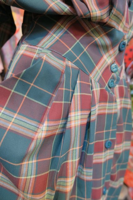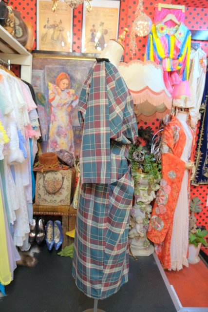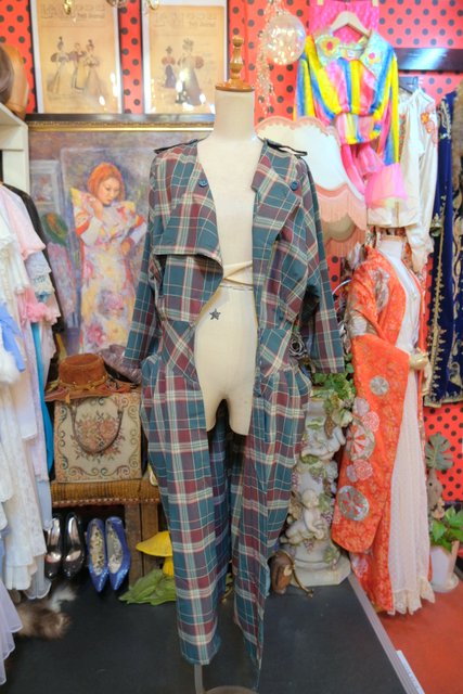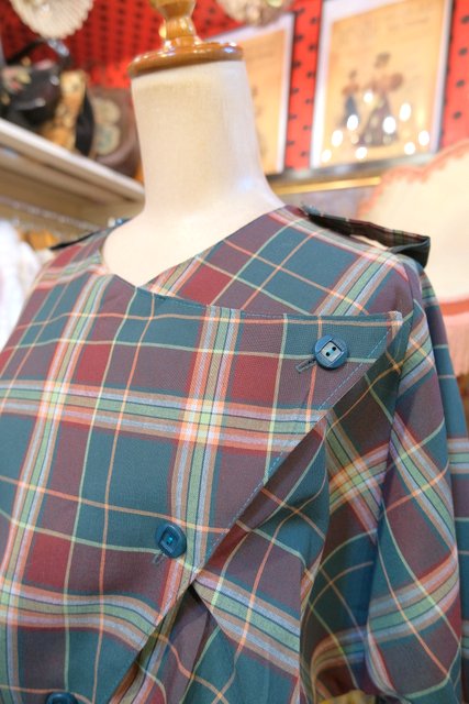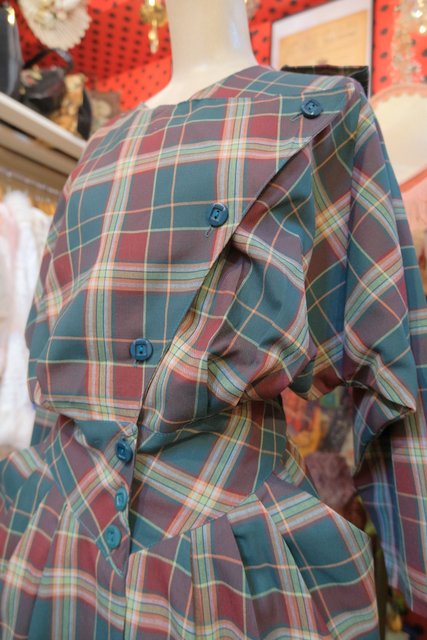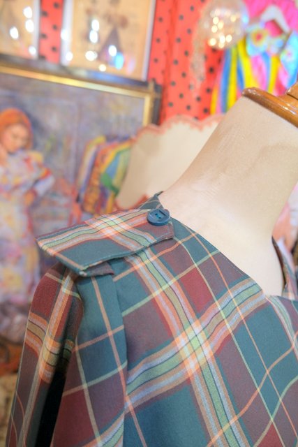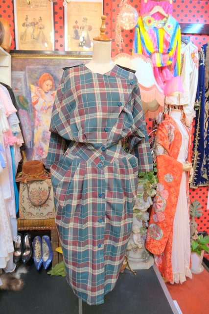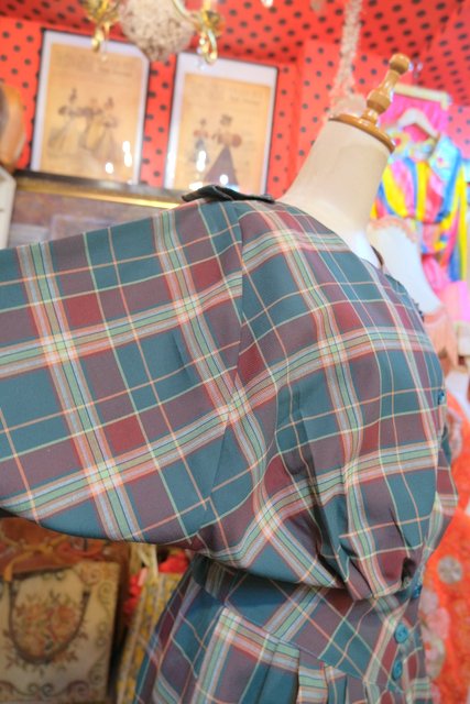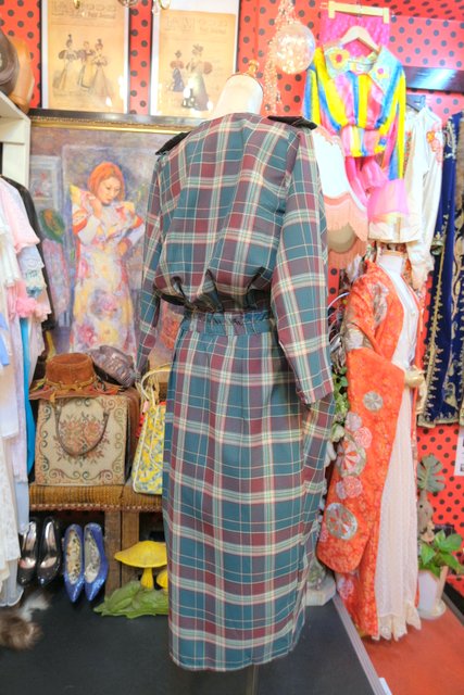 ミリタリールックなカーキ、マルーン系のチェックにエポレットやタック入りのタイトスカートがカッコいい1970~80年代頃のフランス製ヴィンテージワンピース