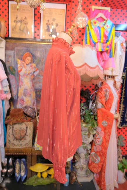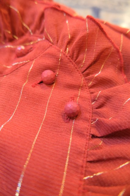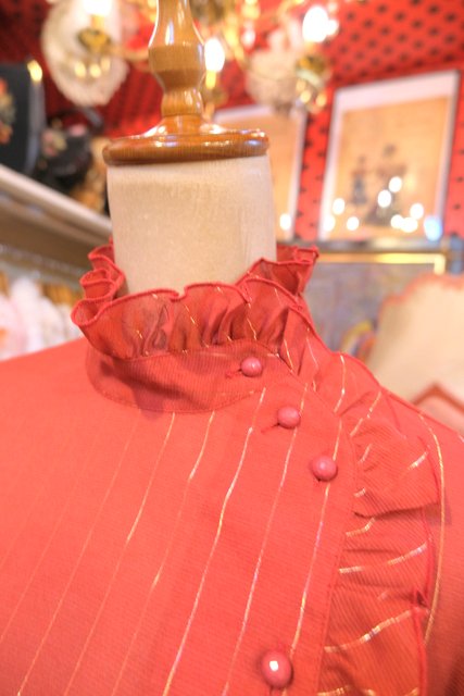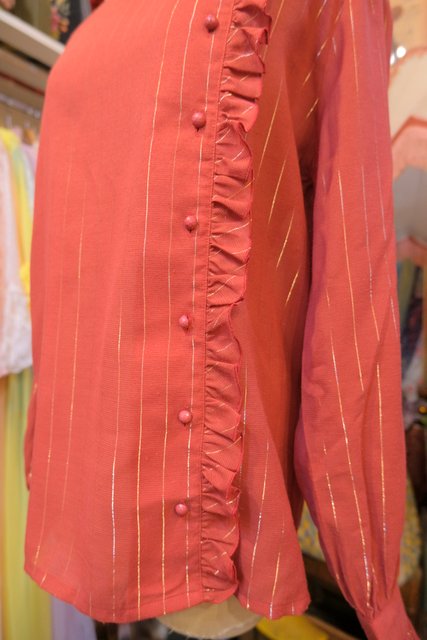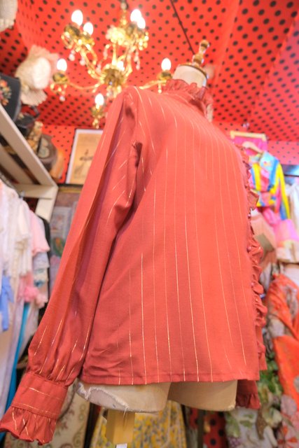 赤レンガ色×ゴールドラインにレトロクラシックなフリルデザインが魅力的な1970年代頃のヨーロピアンヴィンテージブラウス