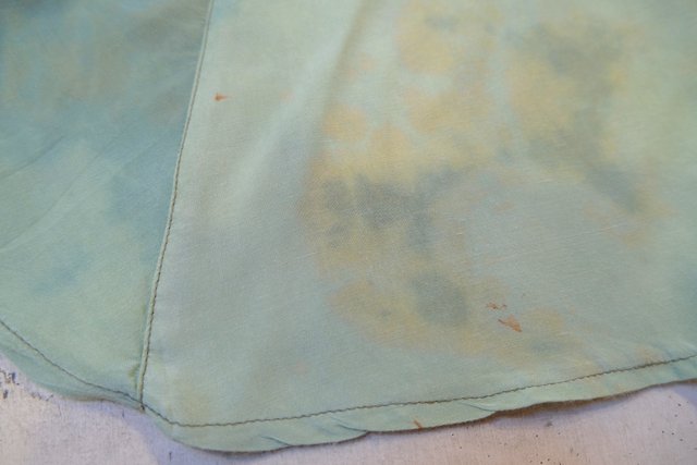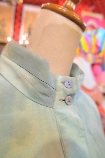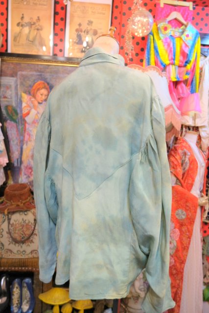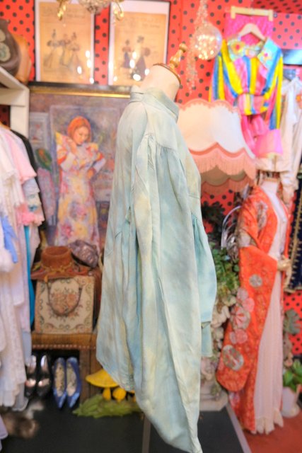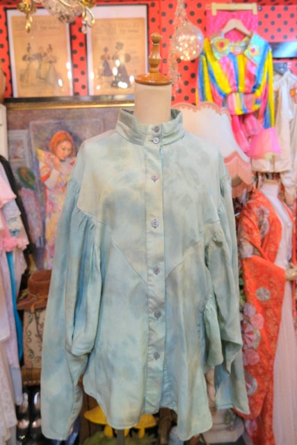 くすんだ黄緑色、オレンジ系のタイダイカラーにドレープ感があるドルマンスリーブが素敵な1980年代頃のヨーロピアンオーバーサイズシャツ