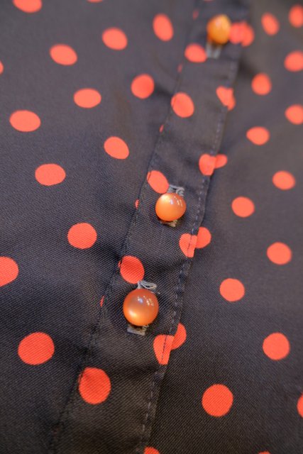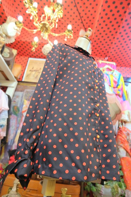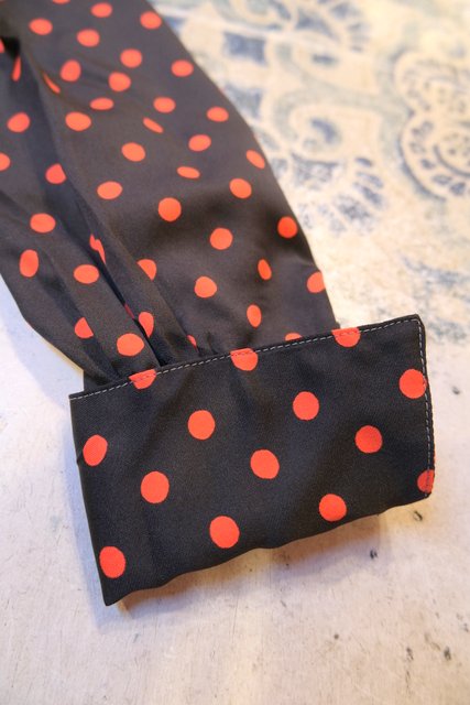 黒×赤ドット柄に2個並びのボタンデザインやミラノカフスがお洒落な1980年代頃のヨーロピアンブラウス