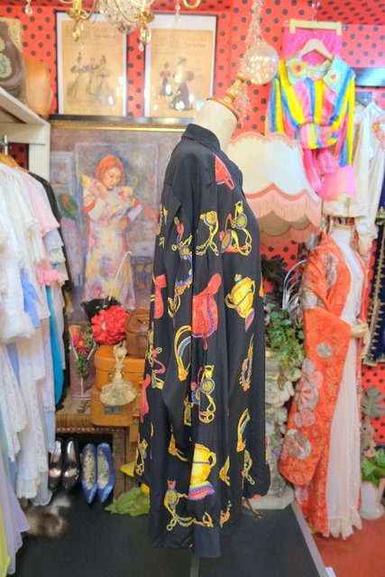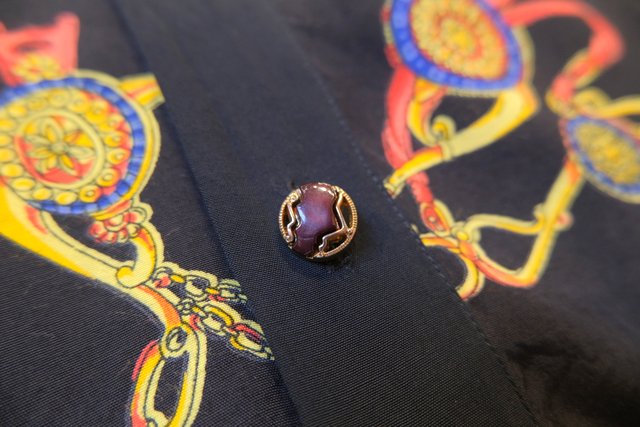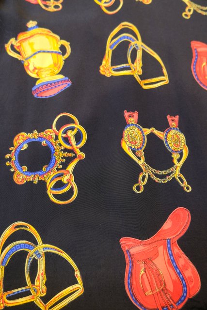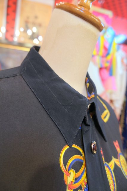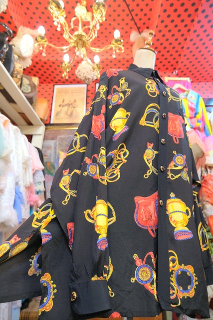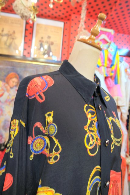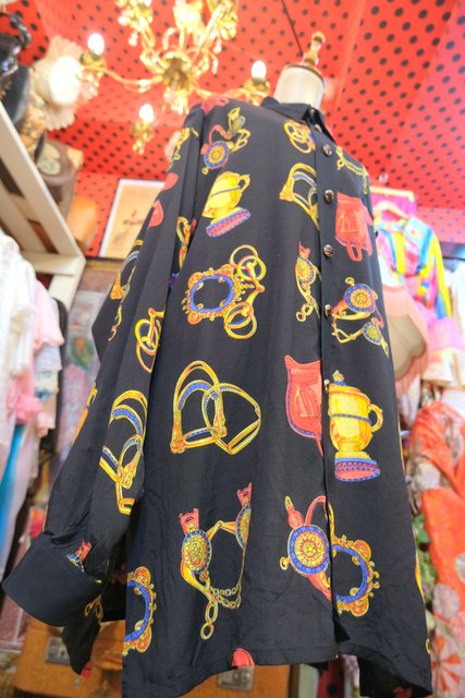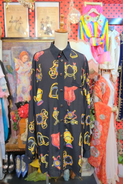 ゴージャスな乗馬用の鞍や拍車などのプリントにレトロボタンがお洒落な1980年代頃のヨーロピアンオーバーサイズシャツ