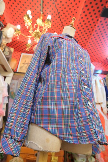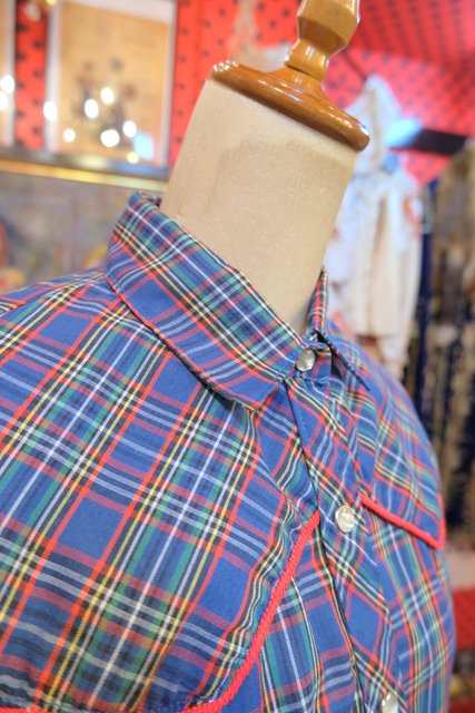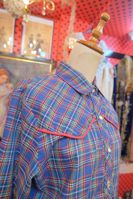 デニムやミニスカート、ウエスタンブーツと相性◎!くすんだブルーベースのチェック柄にヨーク部分の赤テープがお洒落なヨーロピアンウエスタンシャツ