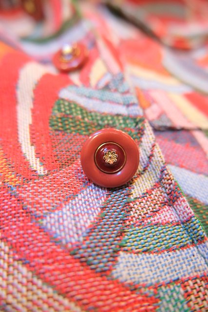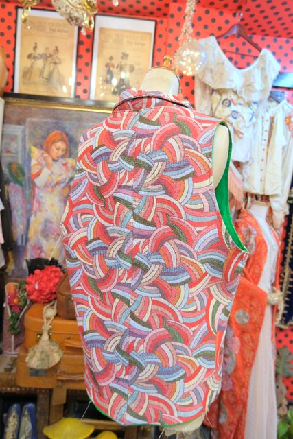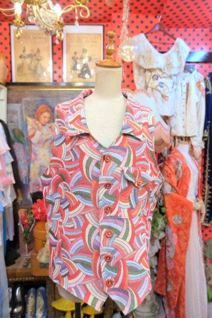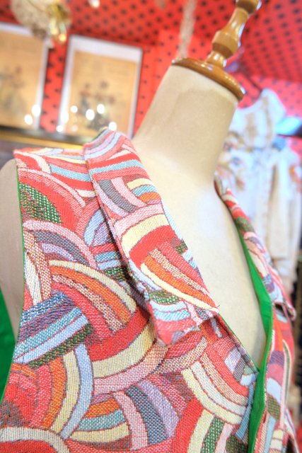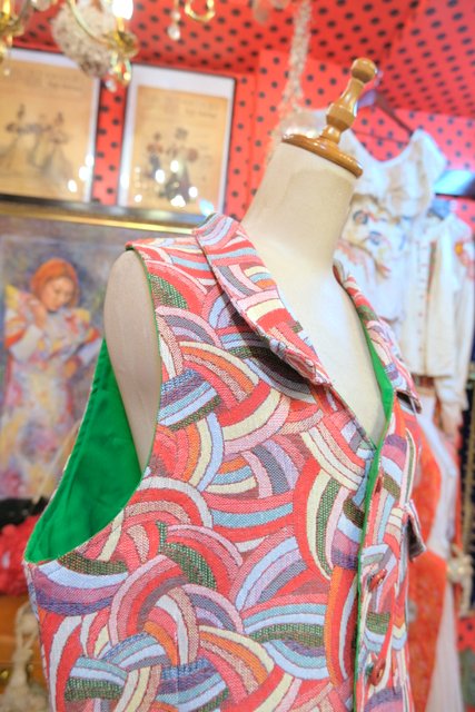 レトロサイケデリックな総柄にゴールドお花付きのボタンや黄緑色の裏地が可愛い1970年代頃のヨーロピアンヴィンテージベスト