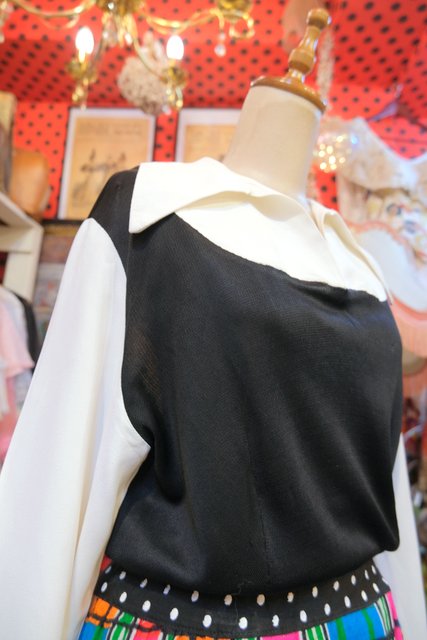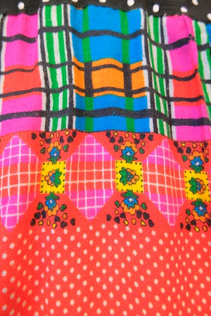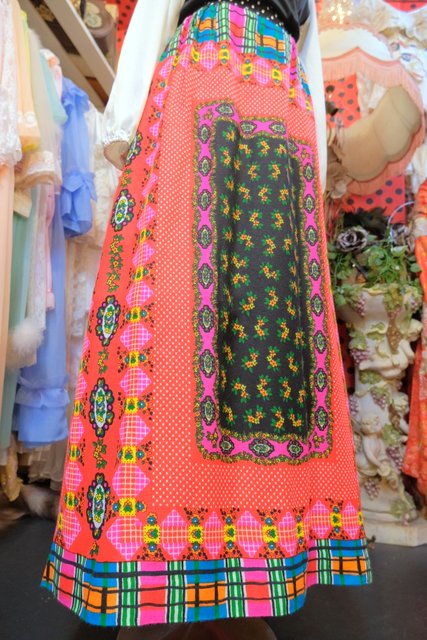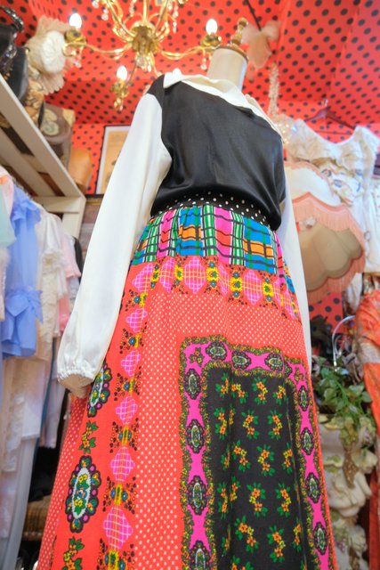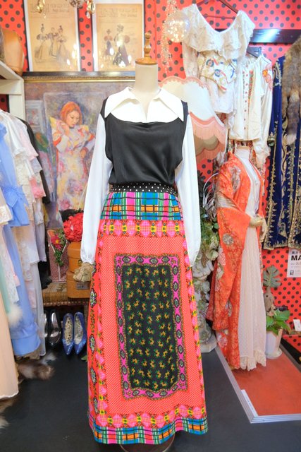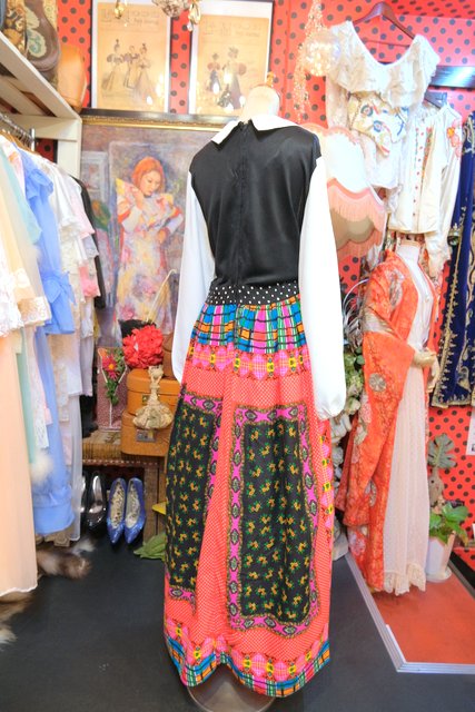 ブラウスとノースリワンピースのレイヤード風デザインにカラフルでレトロなスカートが魅力的な1970年代頃のUSA製J.C. Penneyロングドレス