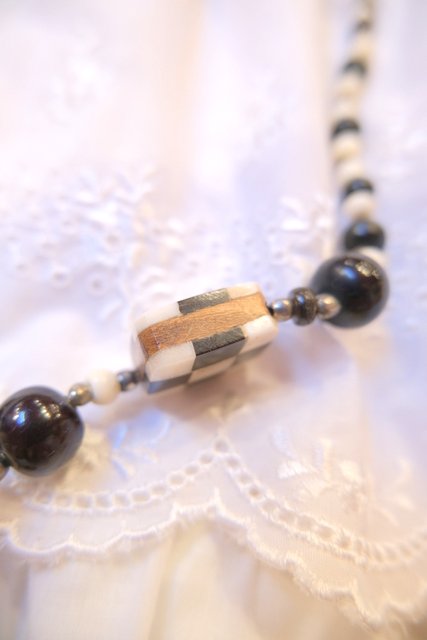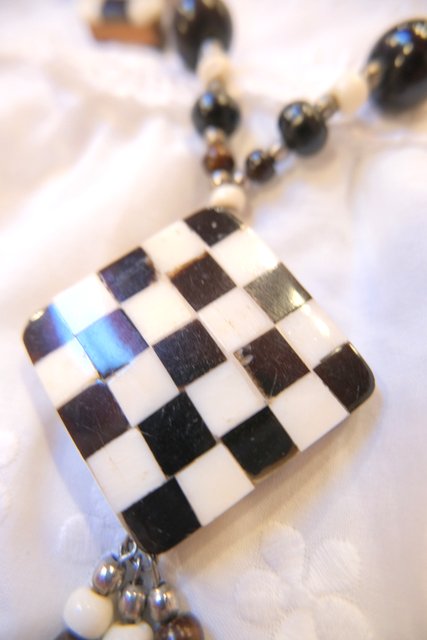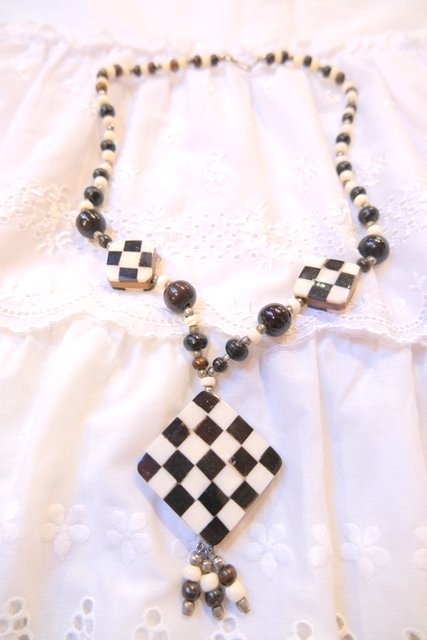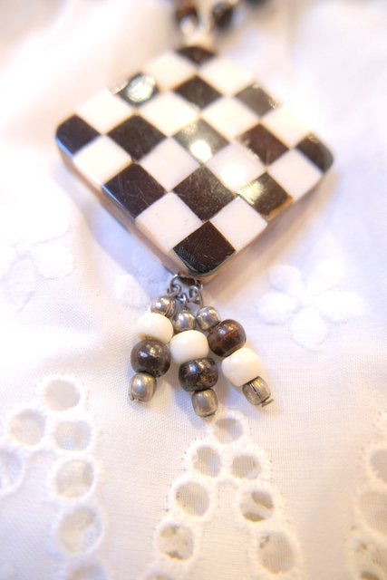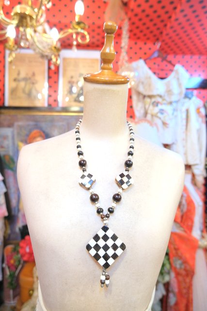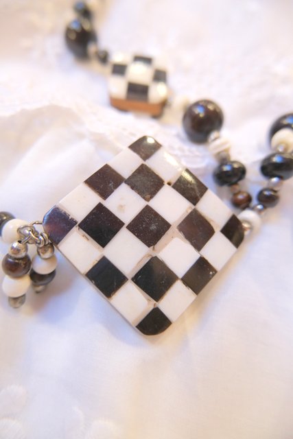 白×黒のセラミックをチェック柄に合わせた個性的デザインが魅力的なアムステルダムで見つけた1970年代頃のヴィンテージネックレス