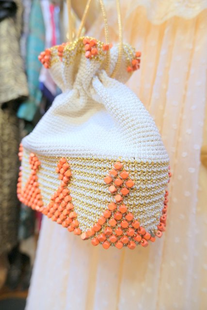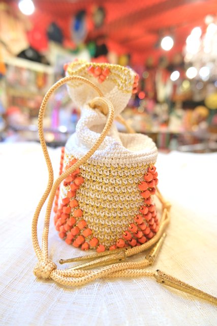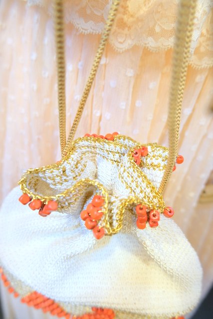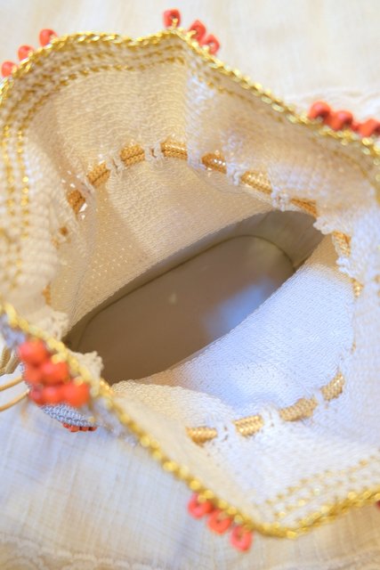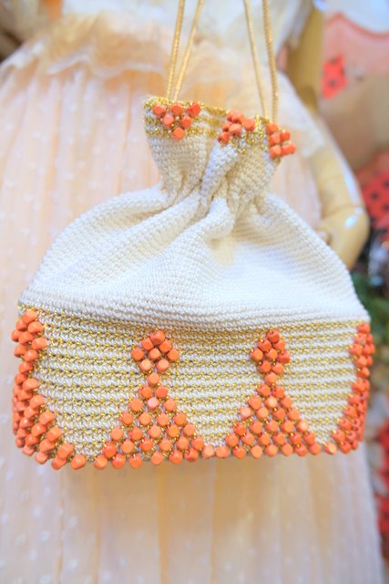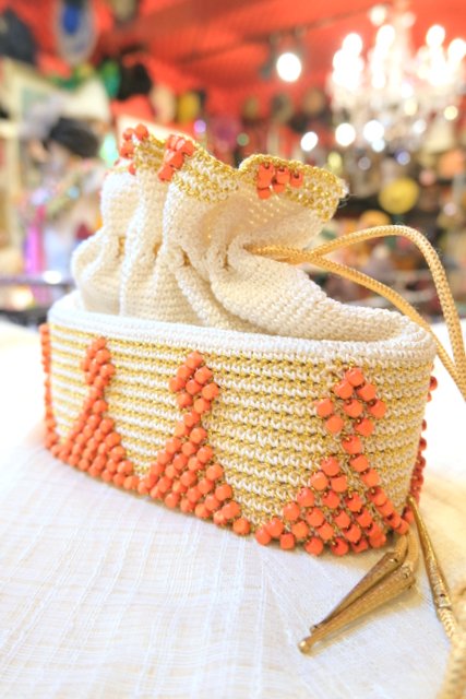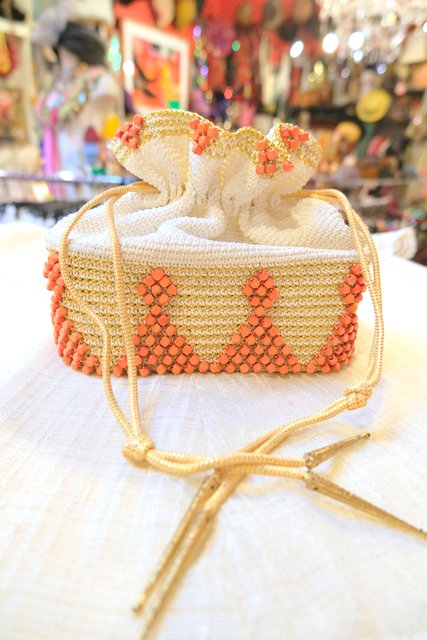 エレガントなゴールド刺繍×オレンジビーズデザインにスカルプチャー金具がお洒落なヨーロピアンエスニックドローストリングポーチ