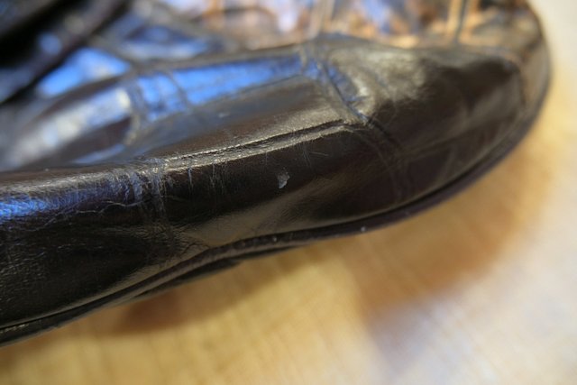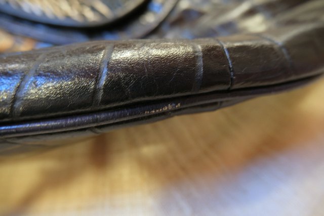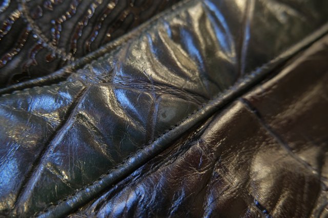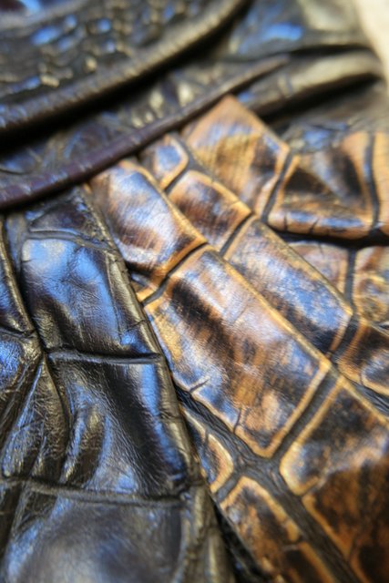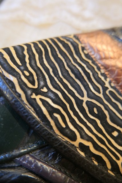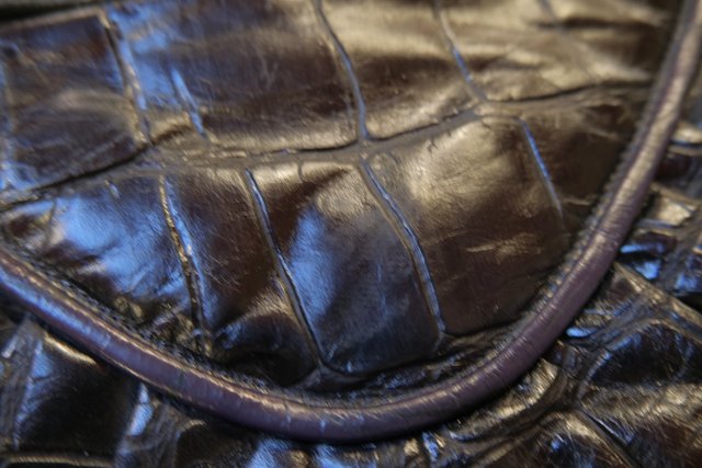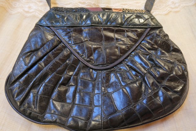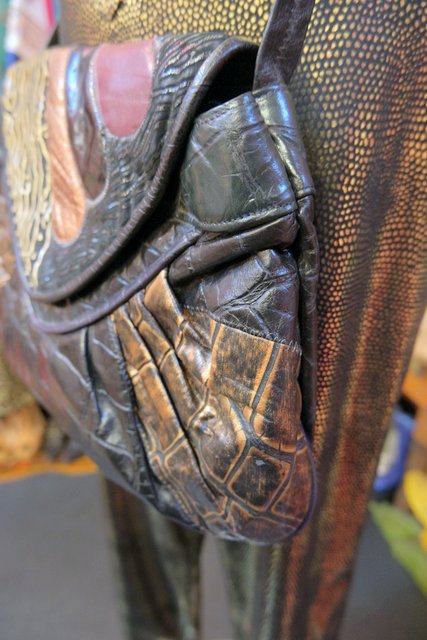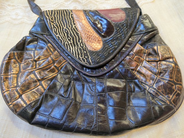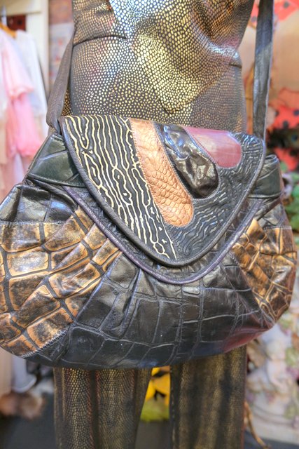 クロコダイルのような型押しデザインにメタリックなペイントやパッチワークが魅力的な1980年代頃のUSA製ヴィンテージショルダーバッグ