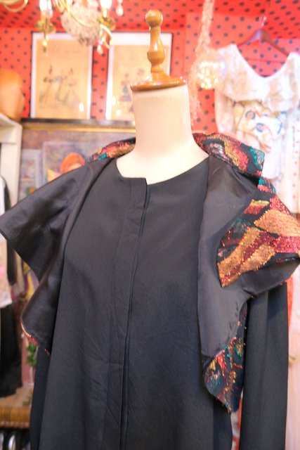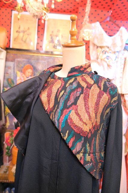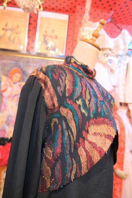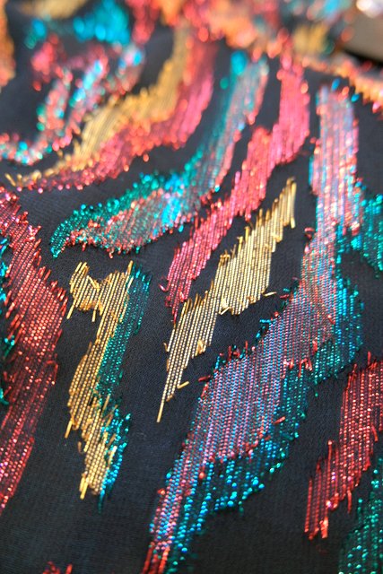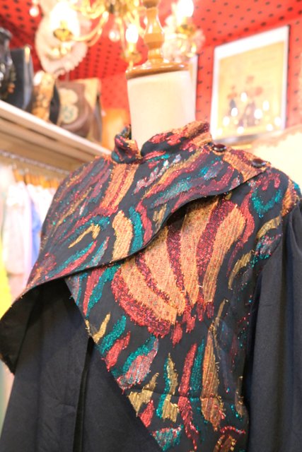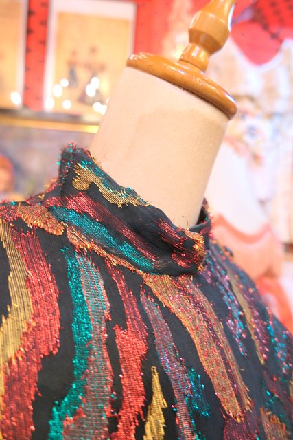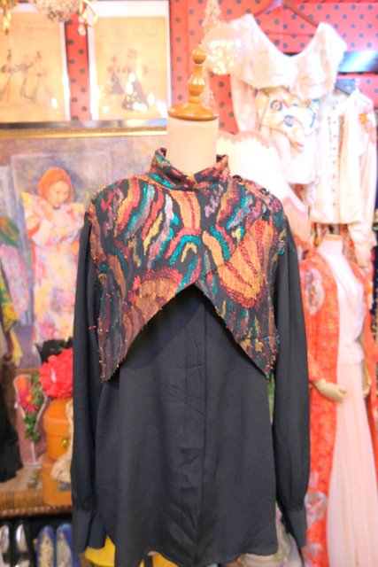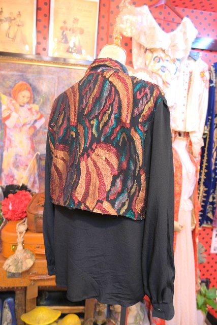 サイケデリックなメタリックショートベスト×黒シャツのレイヤードデザインがお洒落な1980年代頃のUSA製ヴィンテージブラウス
