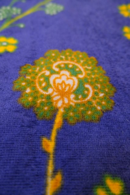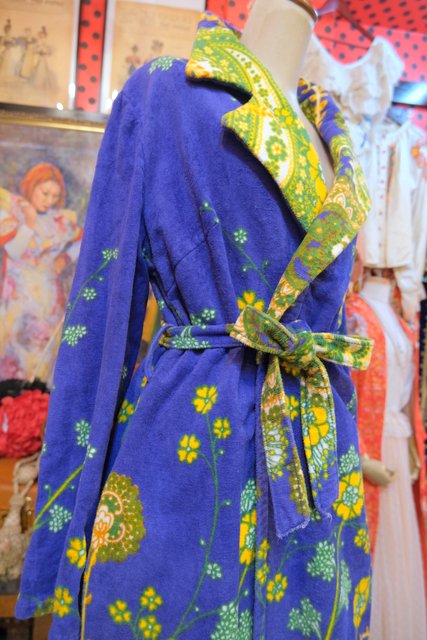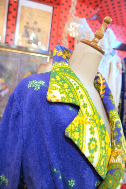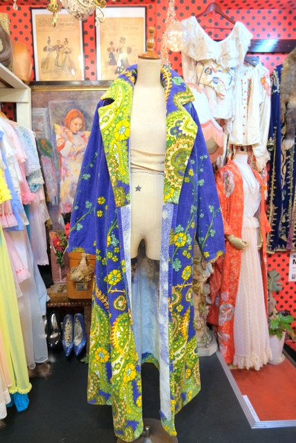 ブルーベースにカラフルなレトロサイケデリック模様が目を惹く1970年代頃のヨーロピアンヴィンテージガウンコート