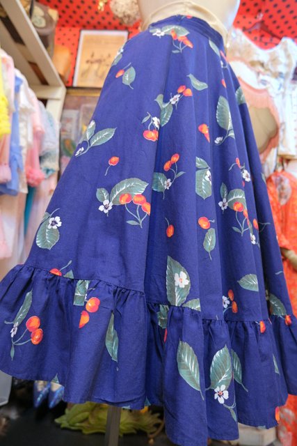 レトロガーリーなサクランボ柄に裾のフリルデザインが可愛い1970年代頃のヨーロピアンヴィンテージフレアスカート