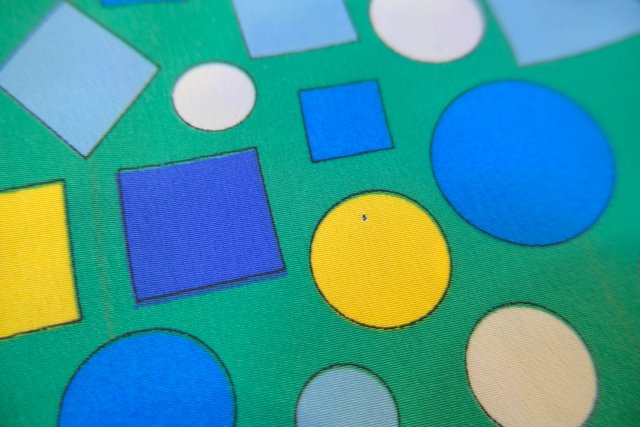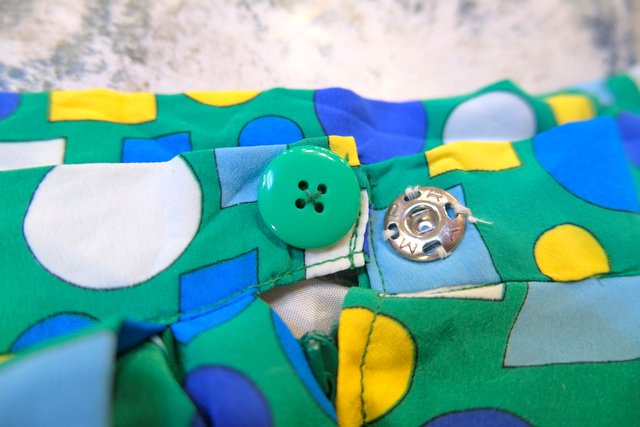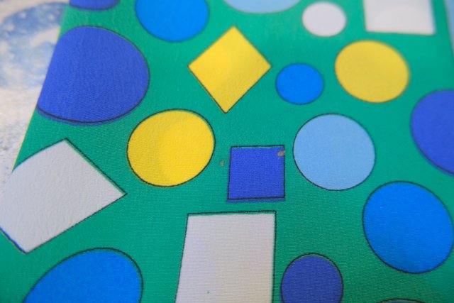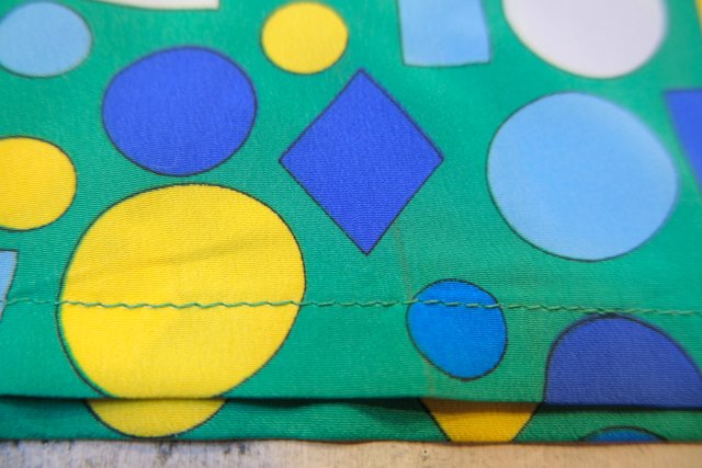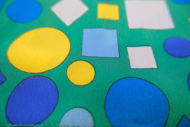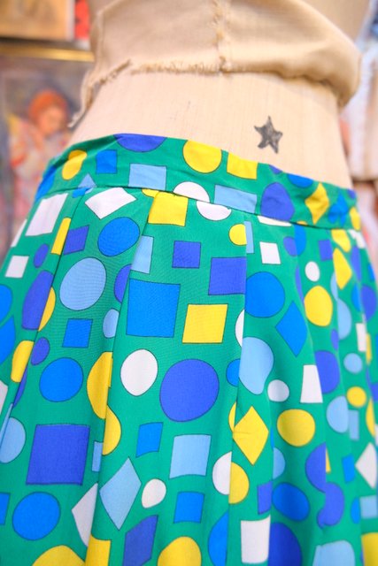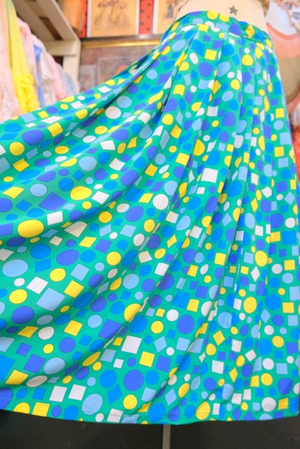 グリーンベースにカラフルポップなドットやスクエア柄が可愛らしい1980年代頃のヨーロピアンフレアスカート