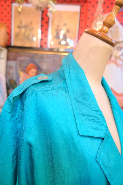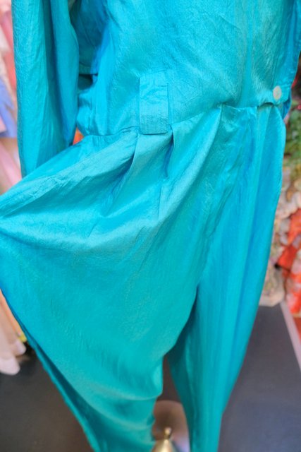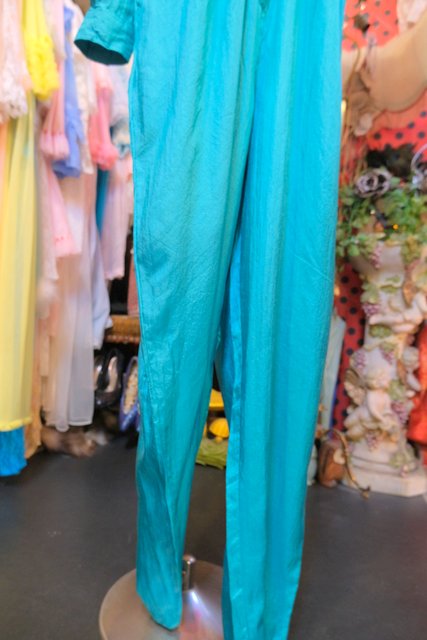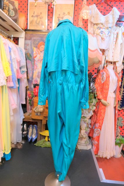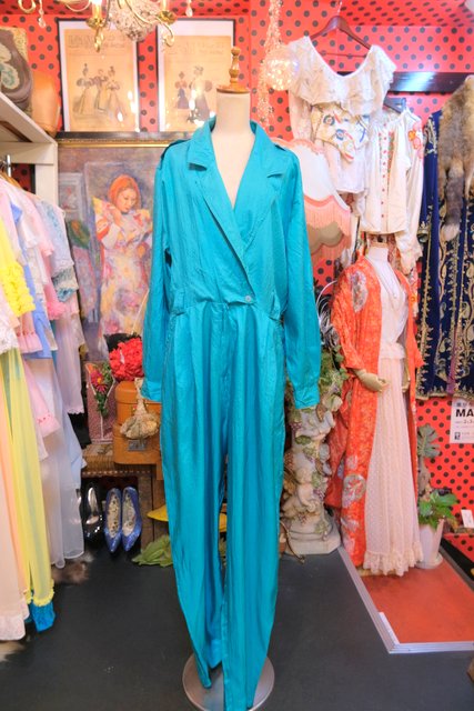 光沢感があるグリーン色にテロっとした落ち感やオーバーサイズがカッコいい1980年代頃のヨーロピアンヴィンテージジャンプスーツ