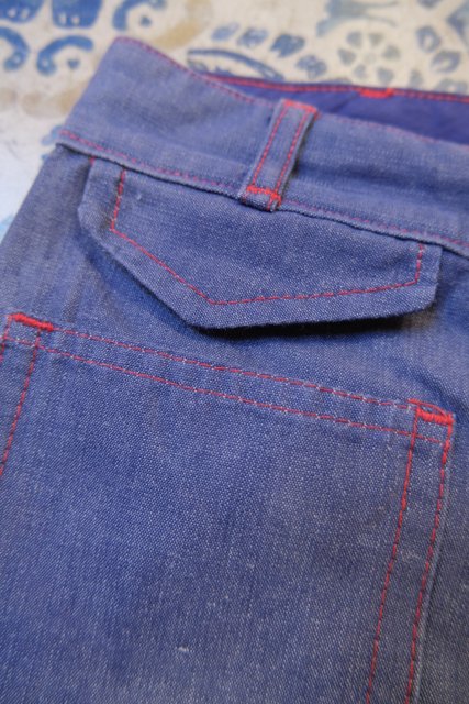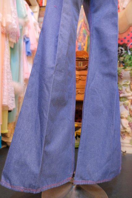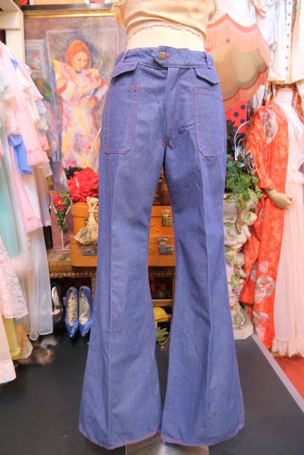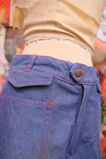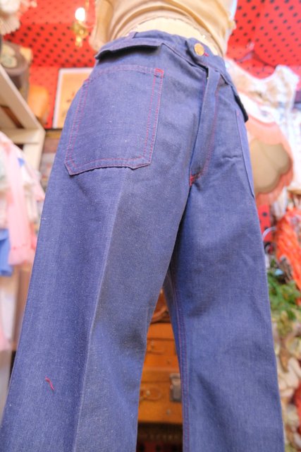 赤いステッチにレトロなポケットデザインやセンタープレスが魅力的な1970年代頃のヨーロピアンヴィンテージデニムフレアパンツ