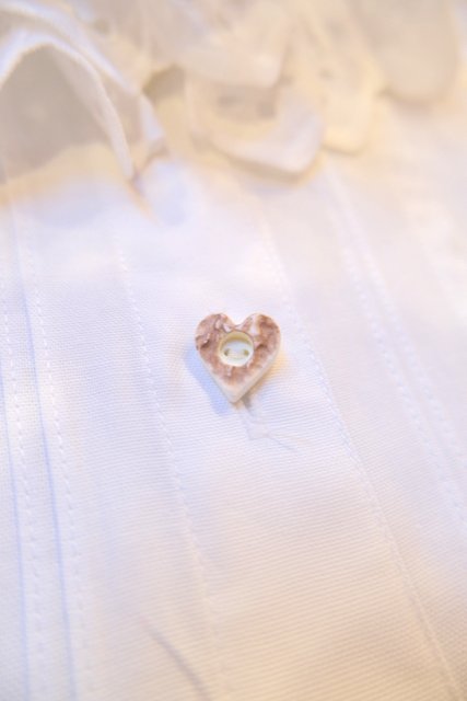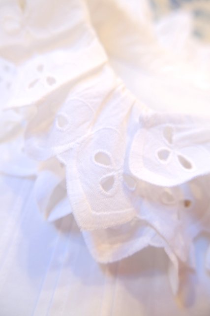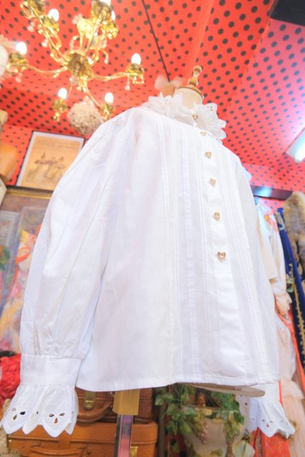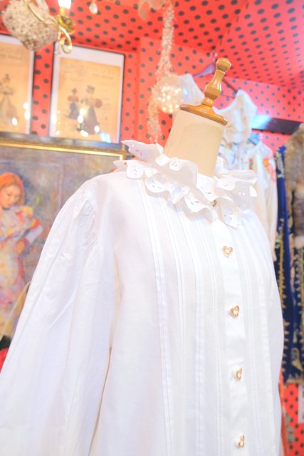 立体的なフリル襟と、フロントに並ぶハートボタンやピンタックの縦ラインが上品でクラシカルな印象の1970年代ヨーロピアンヴィンテージチロルブラウス