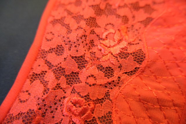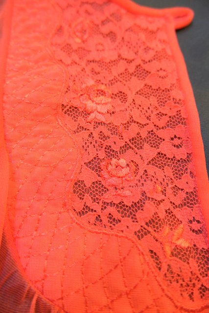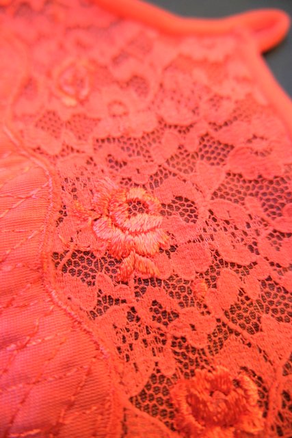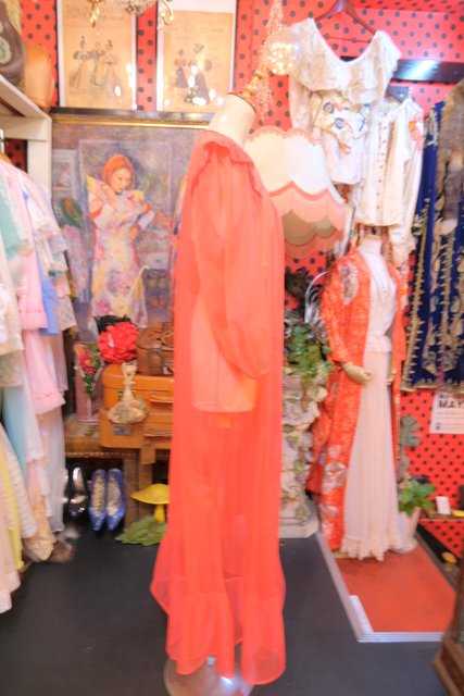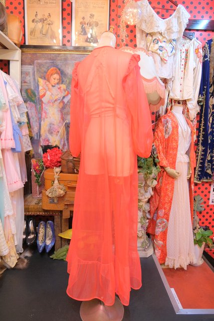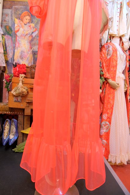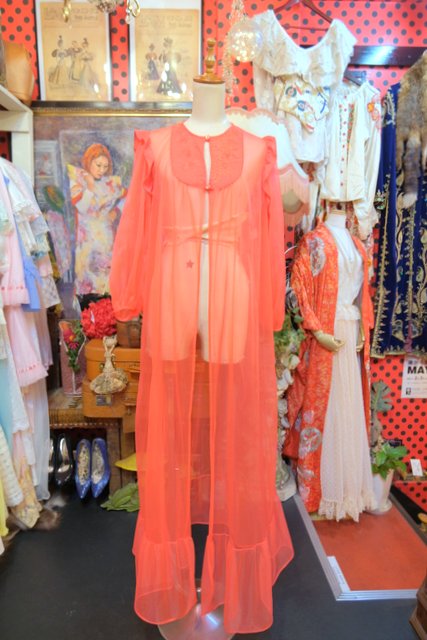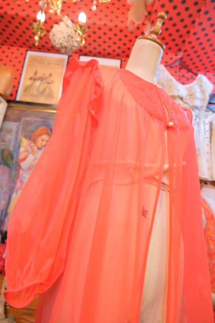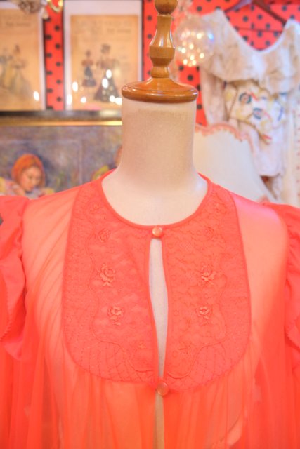 エレガントにもロックな印象にもなる赤シフォンに胸元の刺繍レースやフリルデザインが素敵な1970年代頃のヨーロピアンヴィンテージネグリジェ羽織