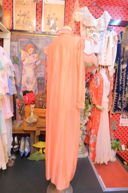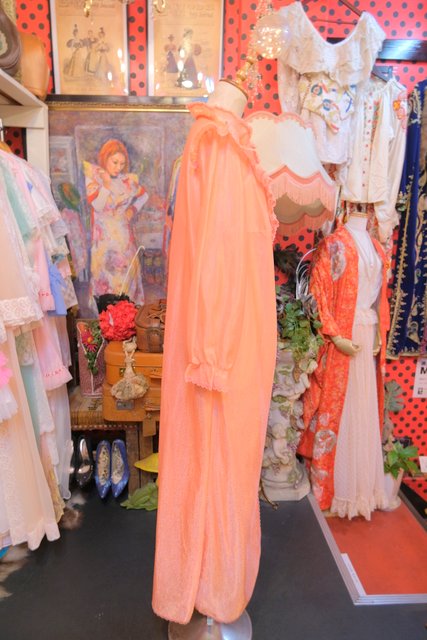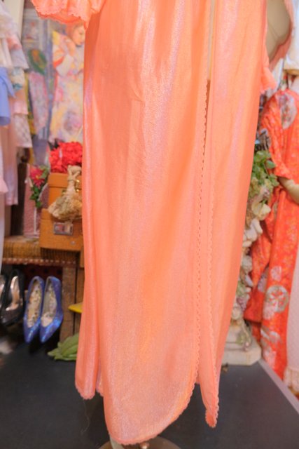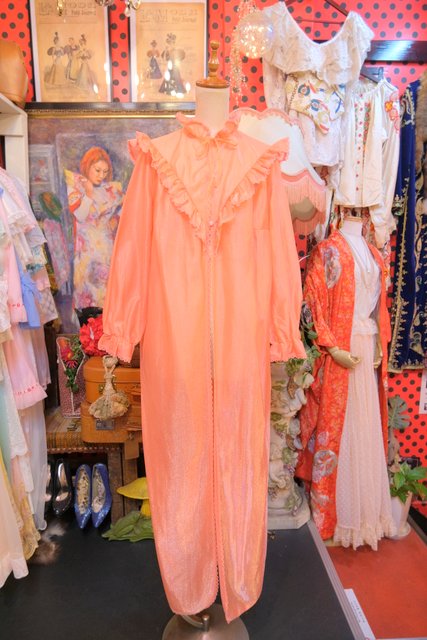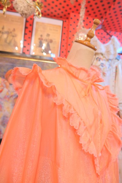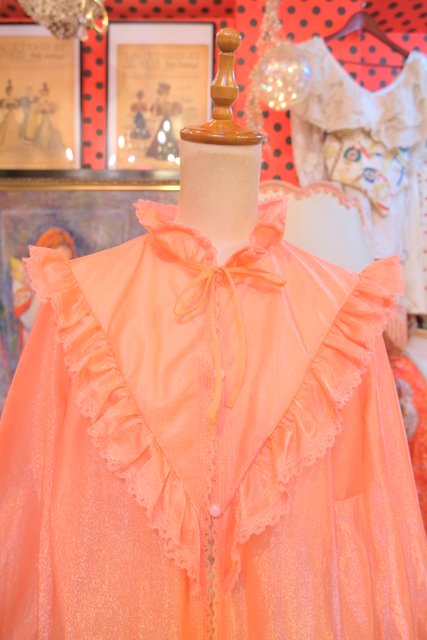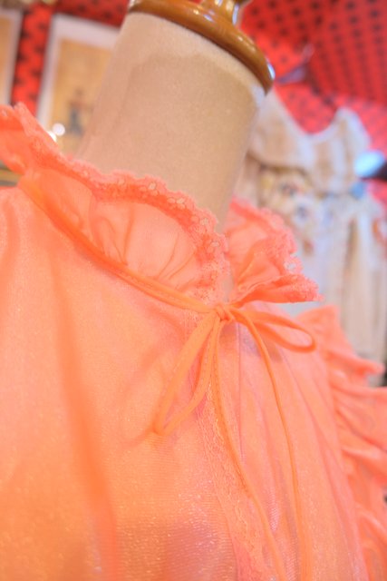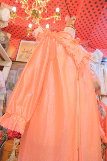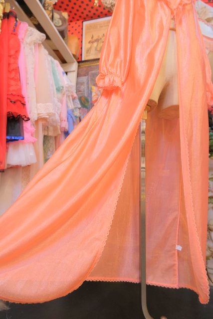 透け感×光沢があるオレンジ色にV字に広がるレースヨークがガーリーな雰囲気を演出させてくれる1970年代頃のヨーロピアンヴィンテージネグリジェ羽織