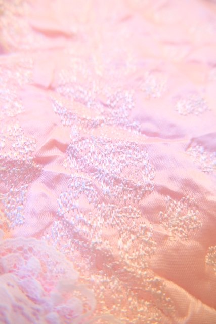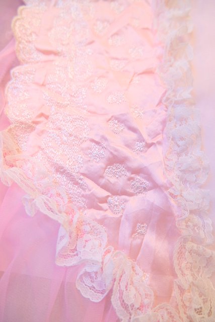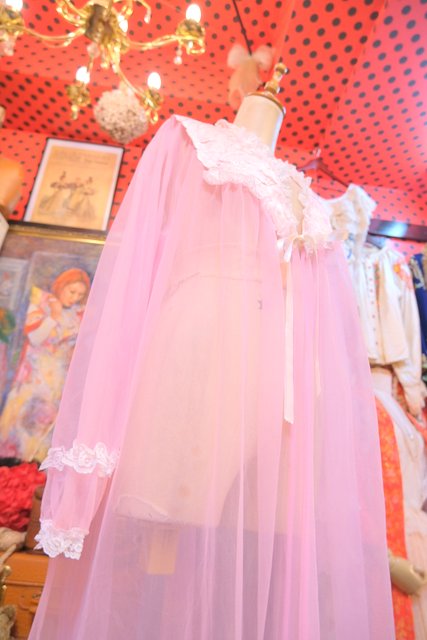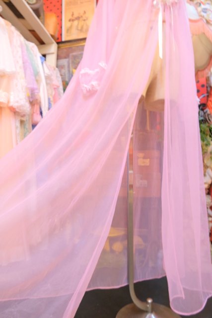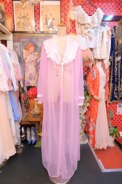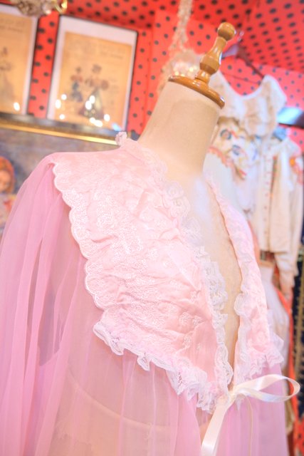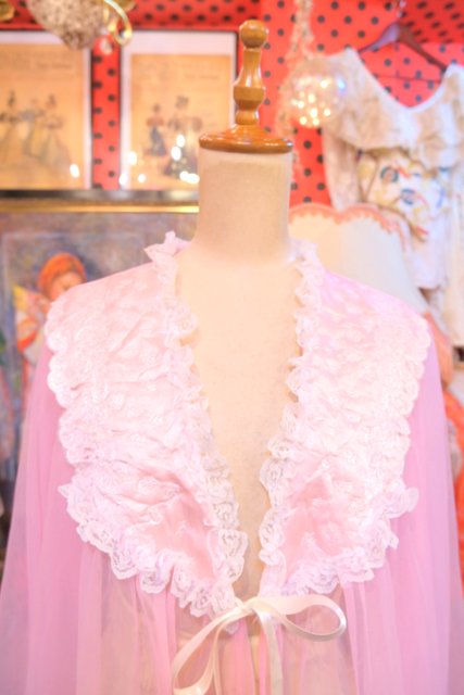 淡いピンクのシフォンに包まれるロマンティックな一枚 しわ加工の刺繍デザインにロマンティックなレースフリルが魅力的な1980年代頃のUSA製ヴィンテージネグリジェ羽織