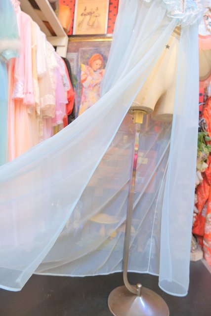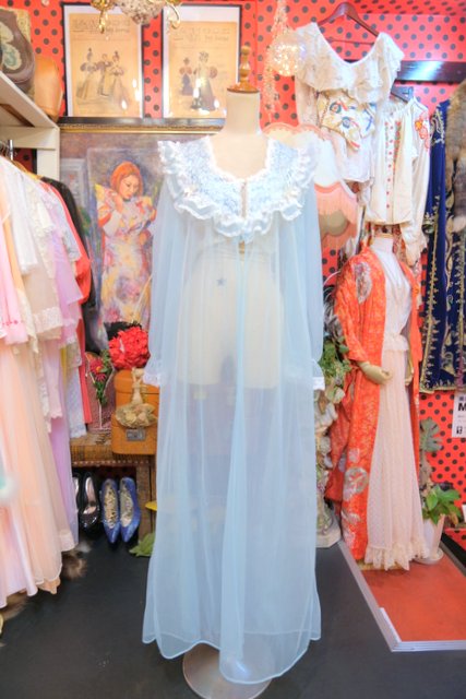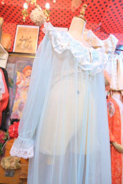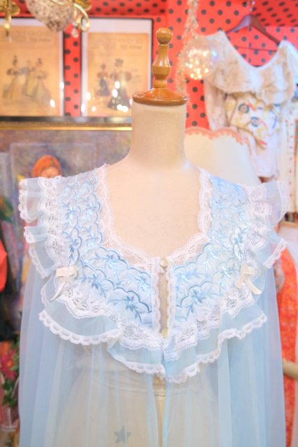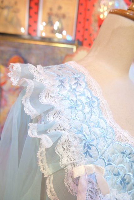ガーリーなお花刺繍やレース付きのフリルデザインに軽やかなシフォン素材が魅力の1980年代USA製ヴィンテージネグリジェ羽織