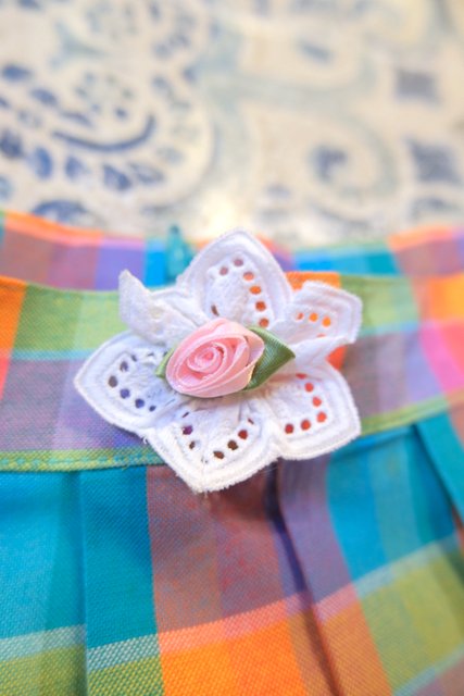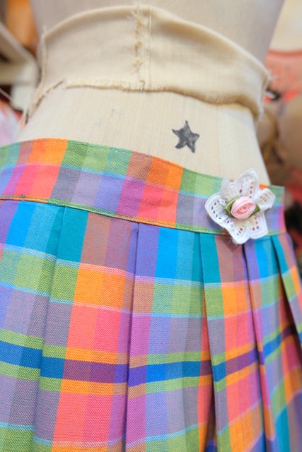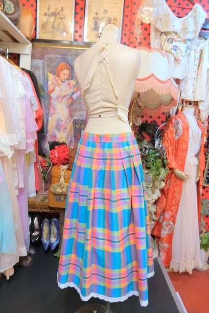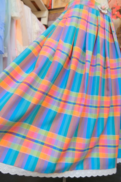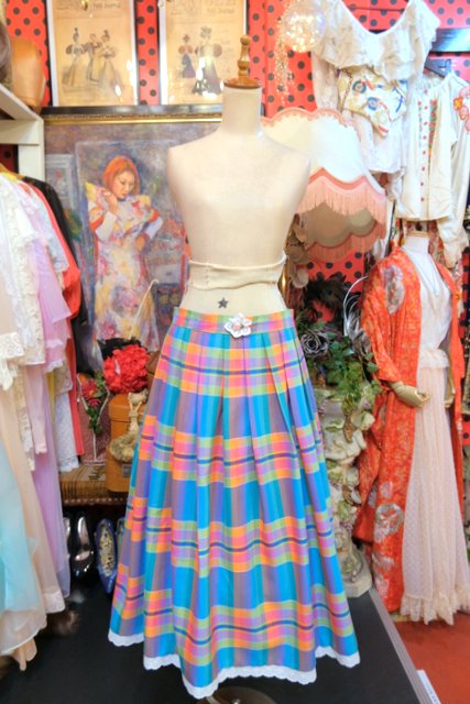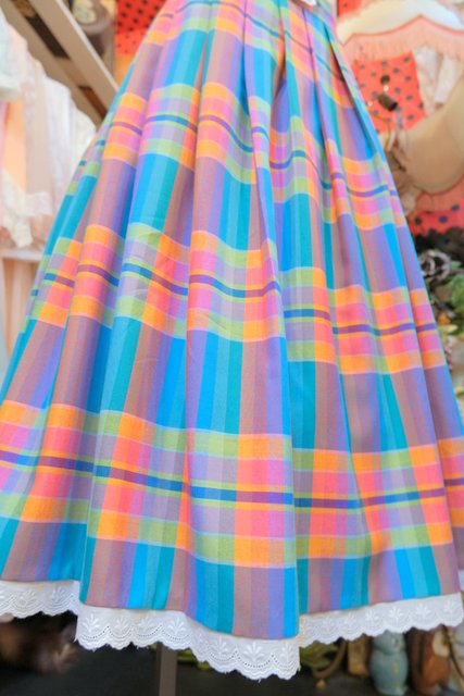 ポップで華やかなマルチカラーのチェック柄にウエストのお花デザインや裾のスカラップコットンレースが魅力的な1980年代頃のドイツ製ヴィンテージスカート