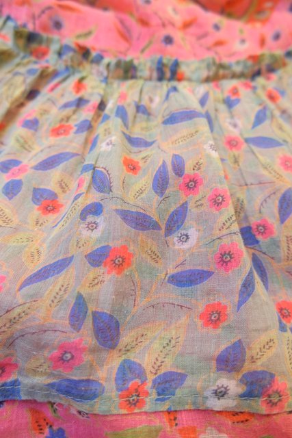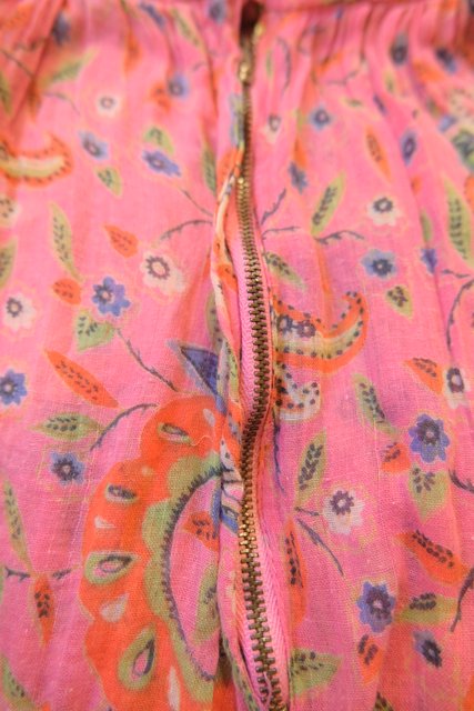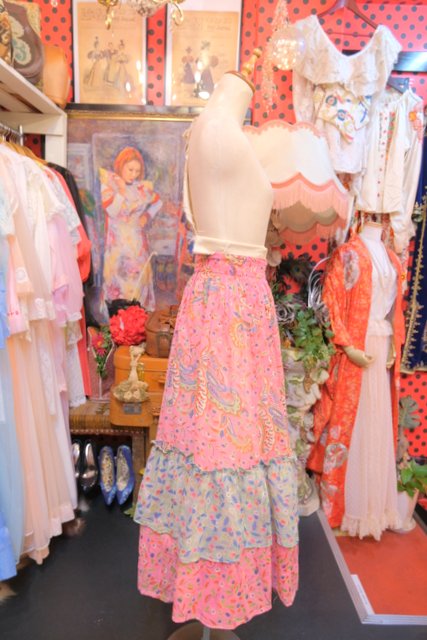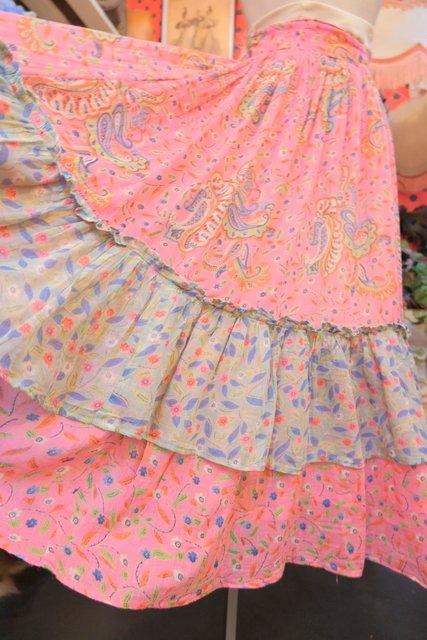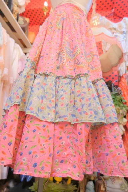 軽やかなコットンにペイズリーと花柄を重ねたティアードデザイン ピンクベースの柔らかいトーンに異なる柄を切り替えることで生まれる奥行きが魅力の1980年代ヨーロピアンヴィンテージスカート