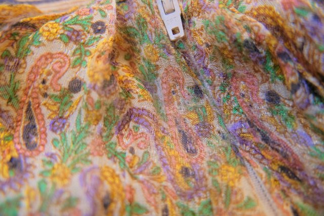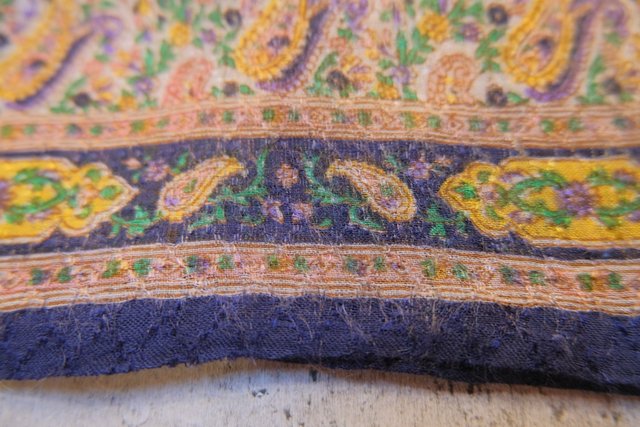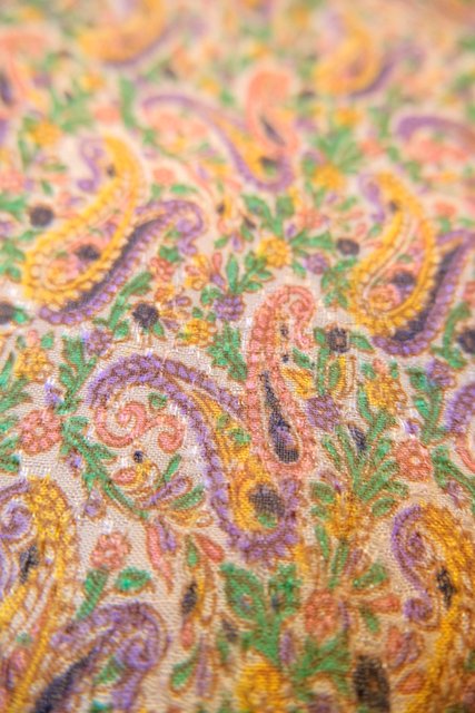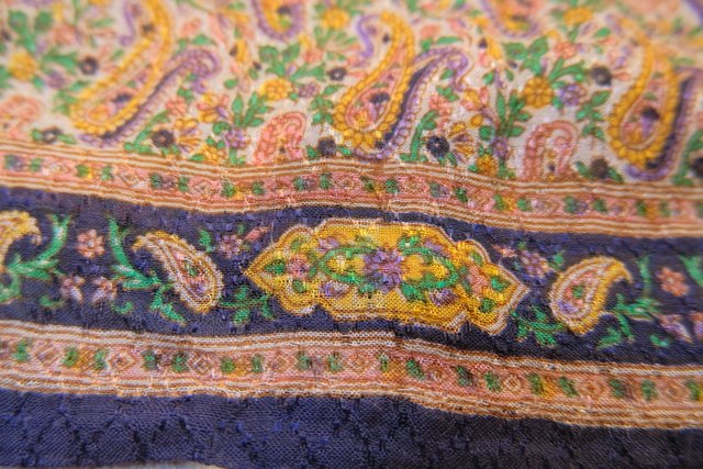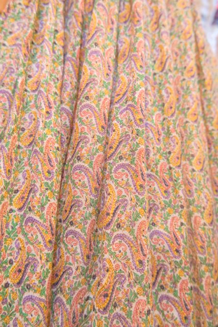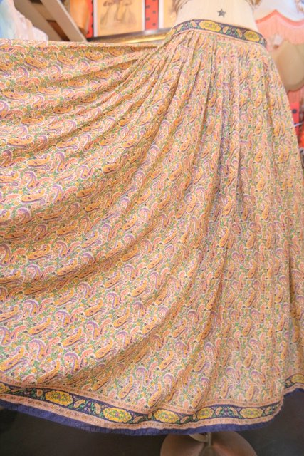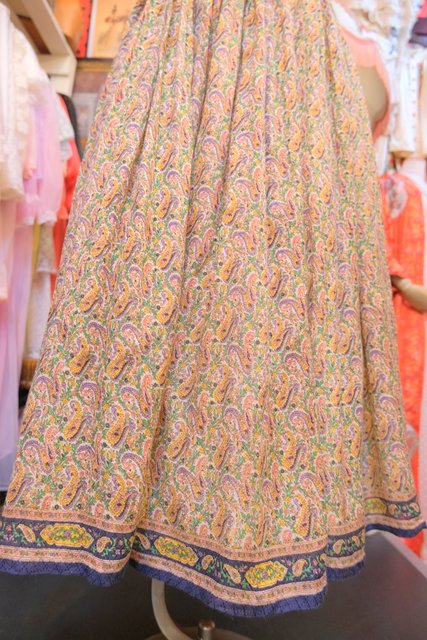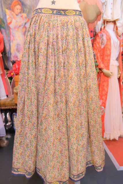 アンティーク感漂うペイズリー柄にウエストと裾のネイビーラインが全体を引き締めてくれる1970年代頃のヨーロピアンヴィンテージエスニックスカート