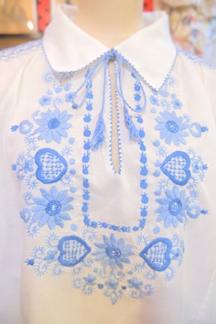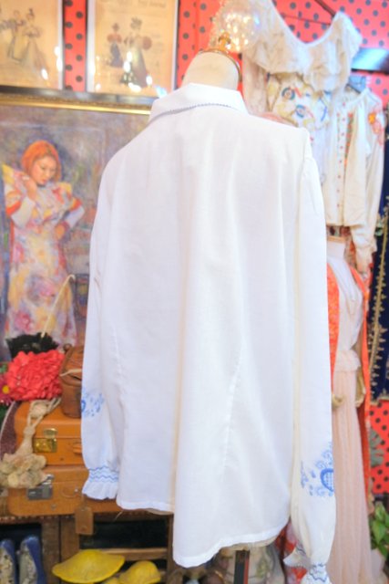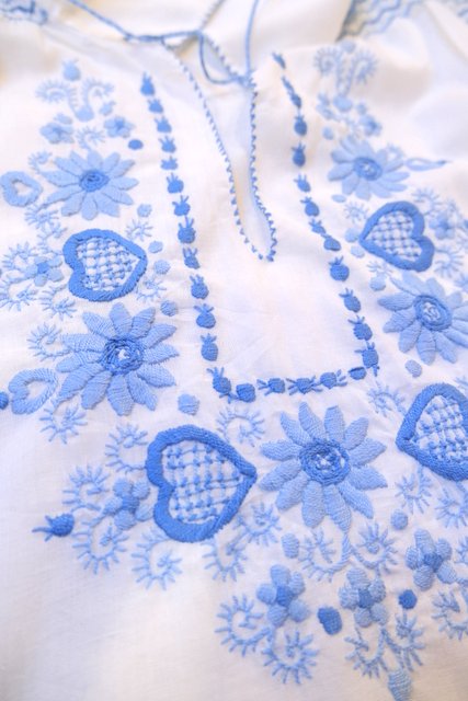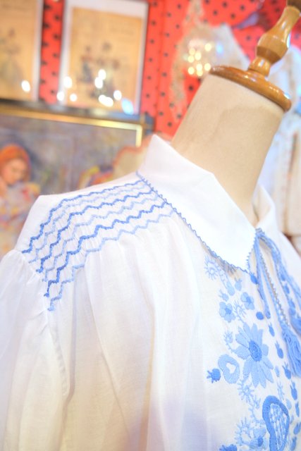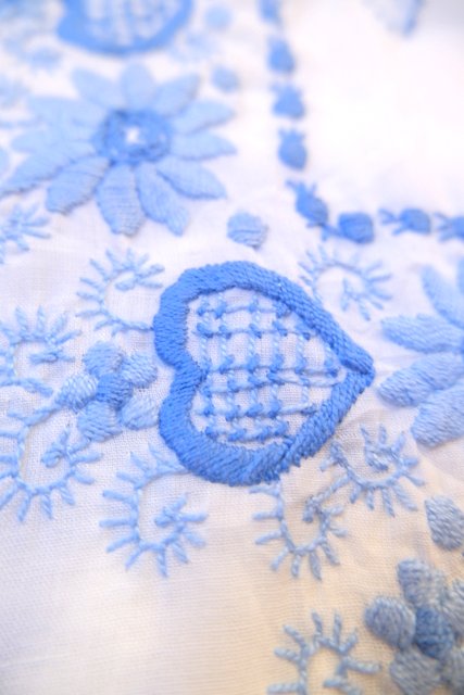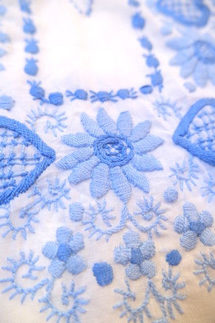 白ベースの軽やかなコットンに淡いブルーの花柄刺繍が落ち着いた雰囲気を演出してくれる1970年代頃のヨーロピアンヴィンテージチュニック