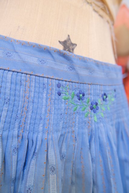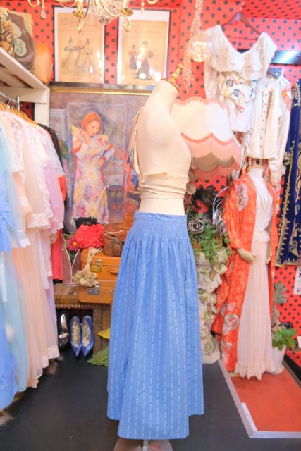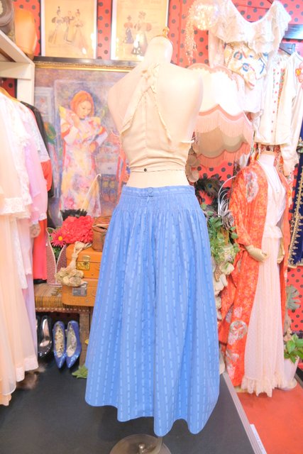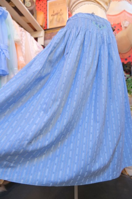 甘すぎない大人ガーリーな印象のシャドウブルーカラーにお花のつぼみや植物モチーフのストライプ柄×ウエストの刺繍が魅力的な1970~80年代頃のヨーロピアンヴィンテージチロルスカート