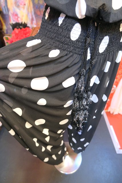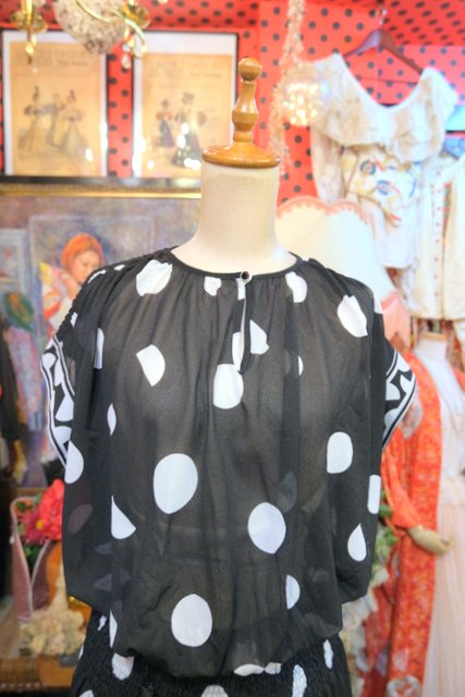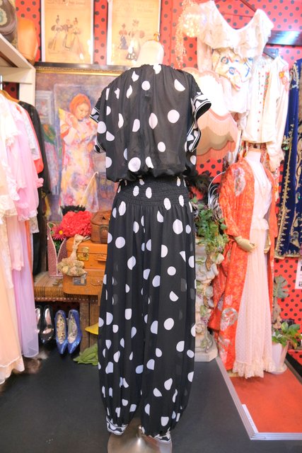 透け感があるドット柄トップスに膨らみがあり裾に向かってすぼまるバルーンパンツデザインがお洒落な1980年代頃のヨーロピアンヴィンテージジャンプスーツ