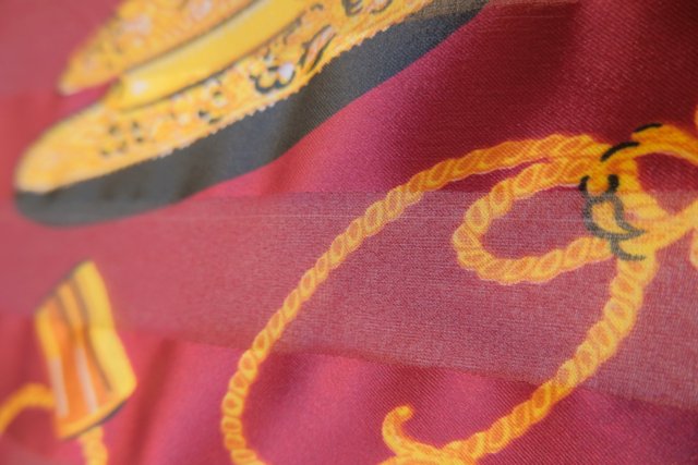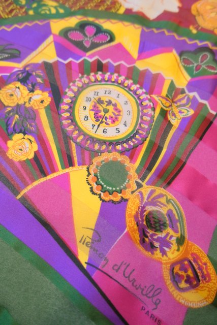 首元やバッグ、ベルト代わりに腰に巻くなどアレンジしやすい万能アイテム 貴婦人柄の扇子やタッセル、時計などカラフルでエレガントな総柄が魅力的なヨーロピアン大判スカーフ