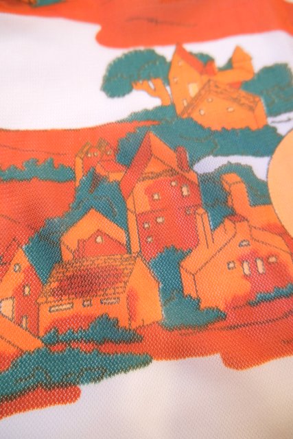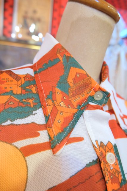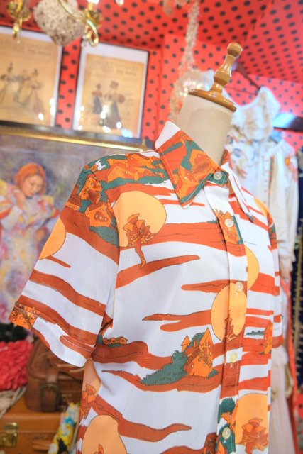 レトロ感たっぷりの色合いに小人柄やカントリーな風景画が魅力的な1970年代頃のヨーロピアン半袖シャツ