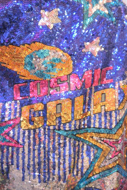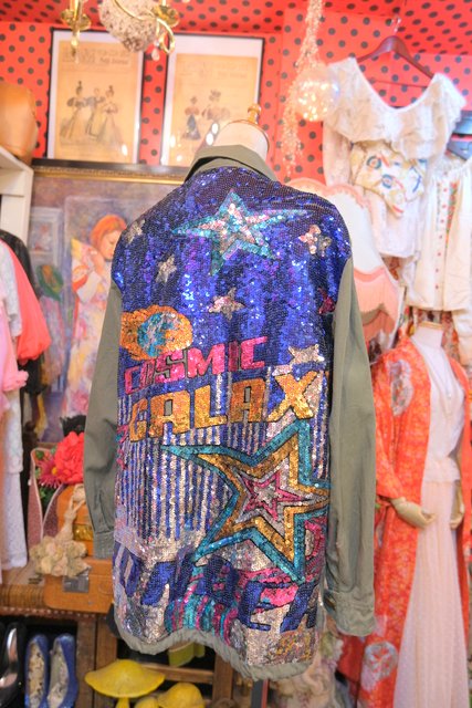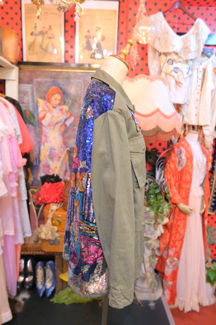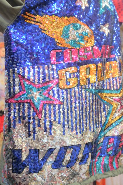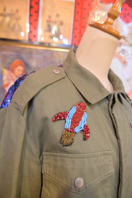 背中に施されたカラフルポップな近未来のスパンコールデザインが目を惹くスペインのカジュアルブランドBershkaミリタリージャケット
