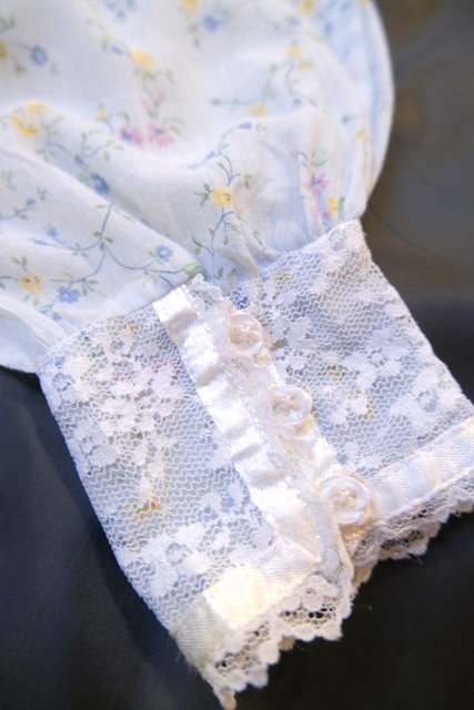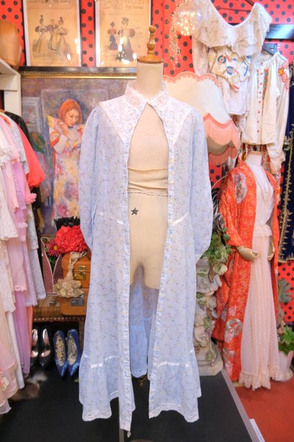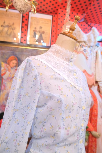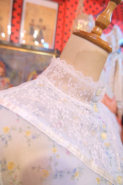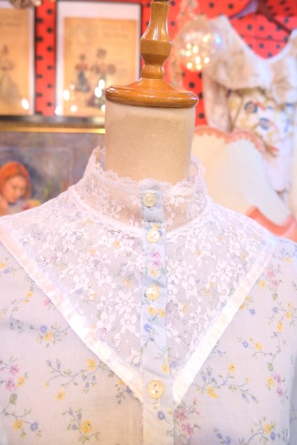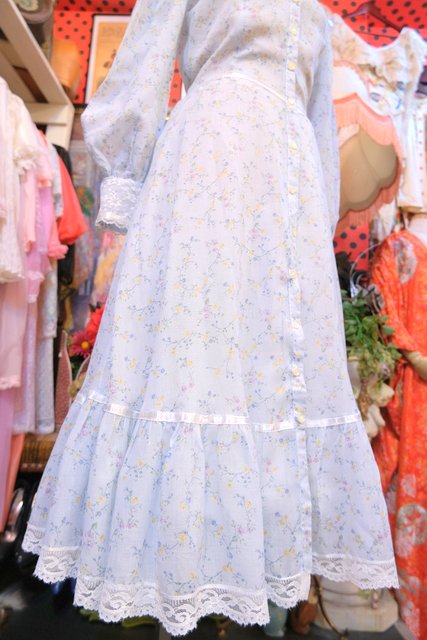 繊細な花柄レースヨークや透け感のあるレース立ち襟、淡い水色に小花が散りばめられた乙女心をくすぐる1970年代頃のUSA製ヴィンテージワンピース