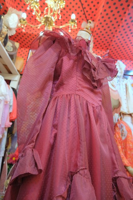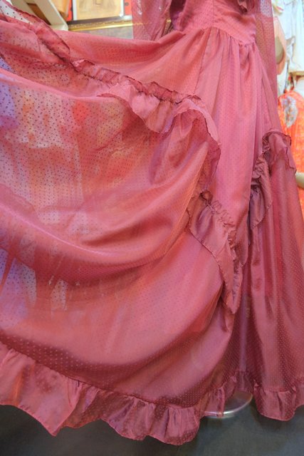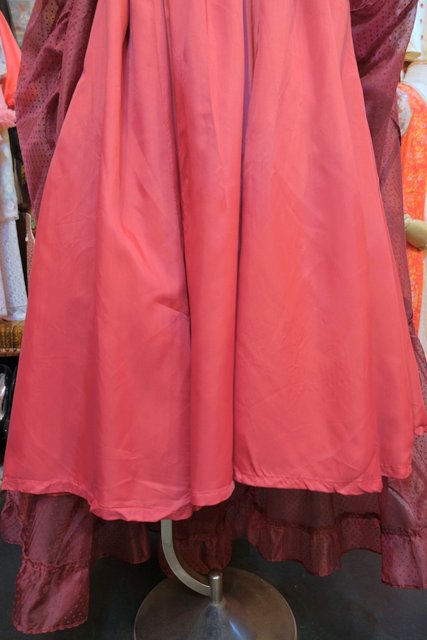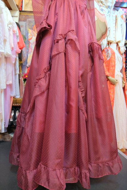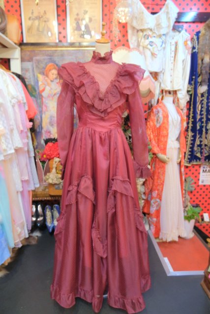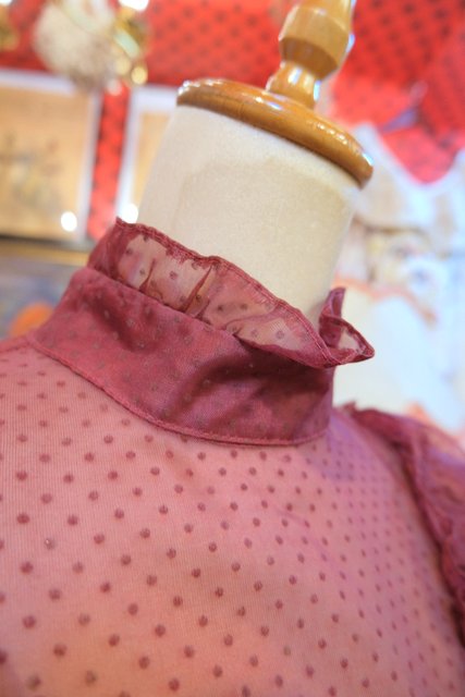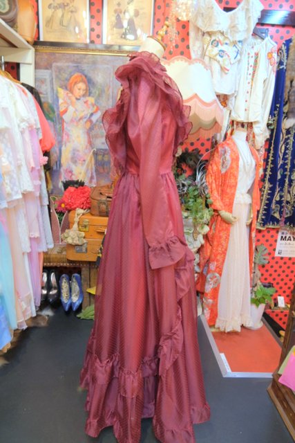 繊細なドットチュールに重なるフリルが、胸元からウエストにかけて立体的な陰影を作り出し動く度に表情が変わり、スカート部分はボリュームがありながらも軽やかでドラマチックに揺れるラインが魅力的。深みのあるボルドーが目を惹くロマンティックな1980年代GUNNE SAXヴィンテージドレス ウエディングや2次会ドレスにおススメ!