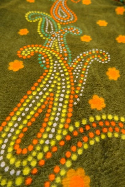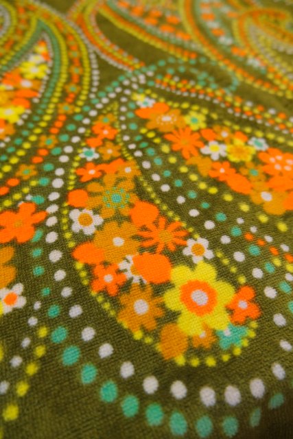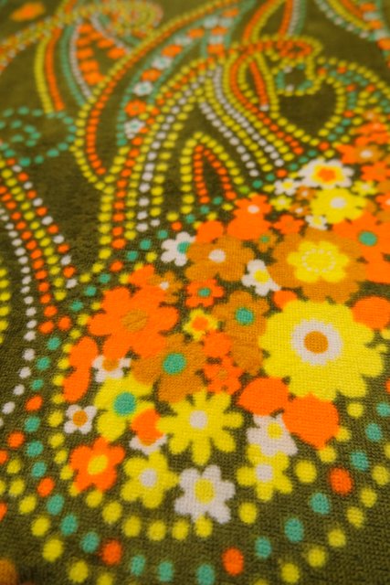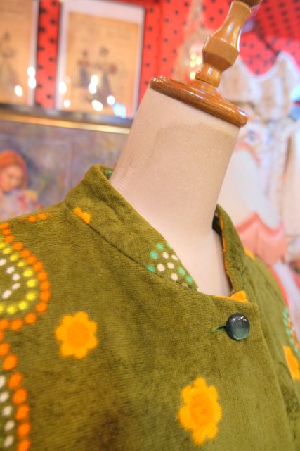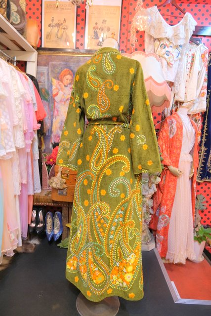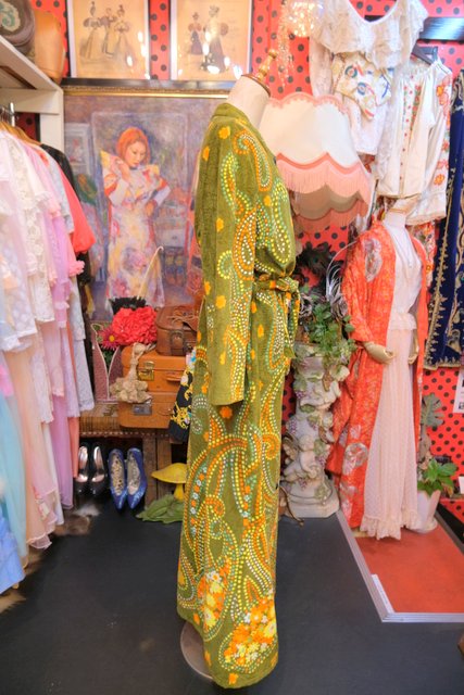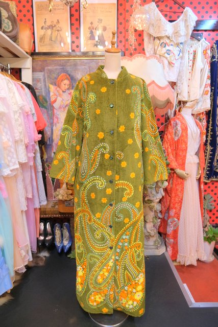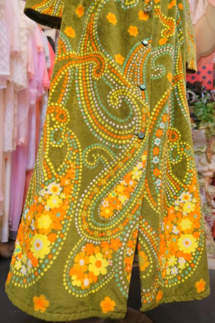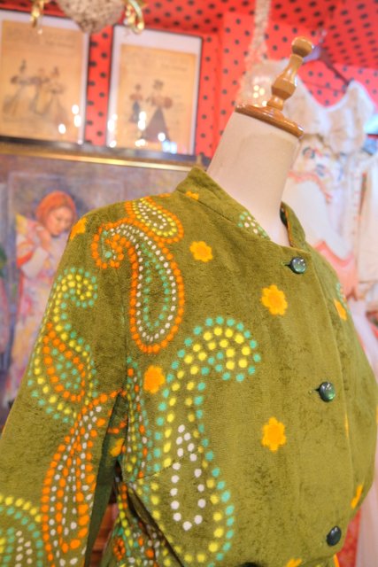 オリーブベースに流れるようなカラフルドットのペイズリー柄やリズミカルに配置されたお花プリントが可愛らしい1970年代頃の旧西ドイツ製ヴィンテージガウンコート