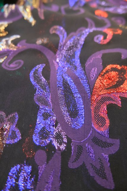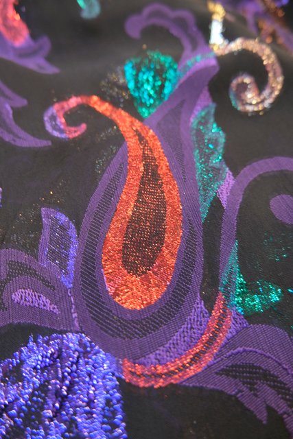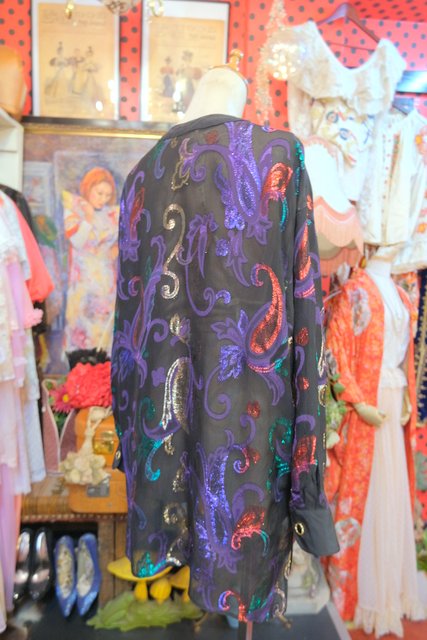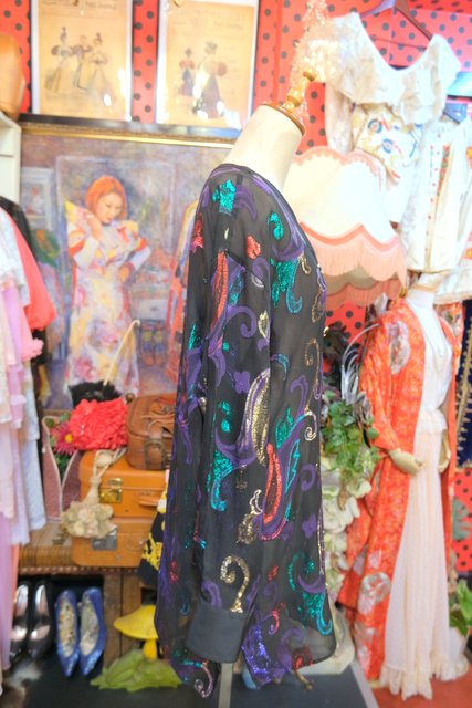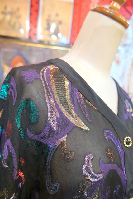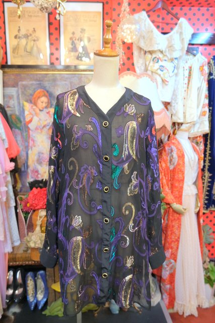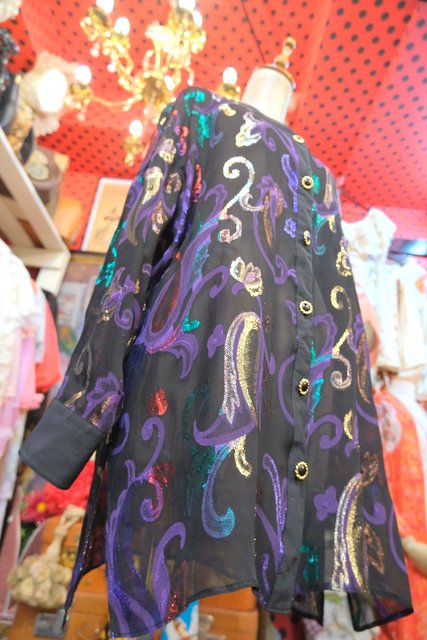 シアーなブラックにパープルやグリーン、ゴールドのサイケデリックペイズリー柄が光の角度で表情が変わるヨーロピアンメタリックシャツカーディガン