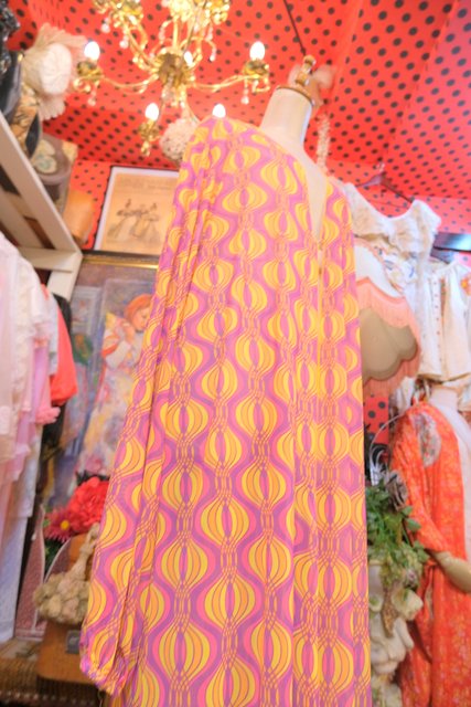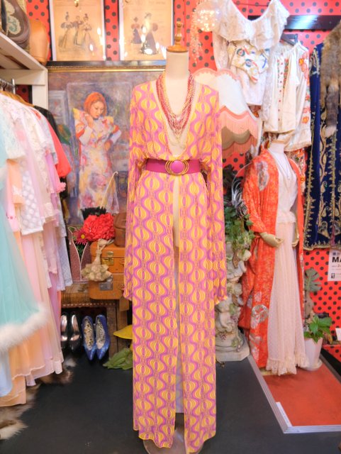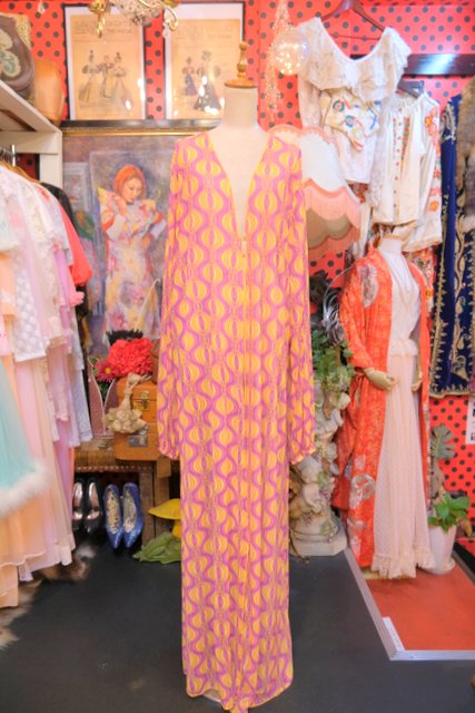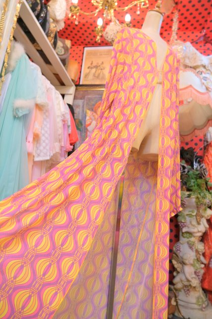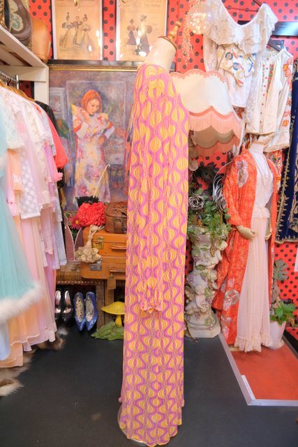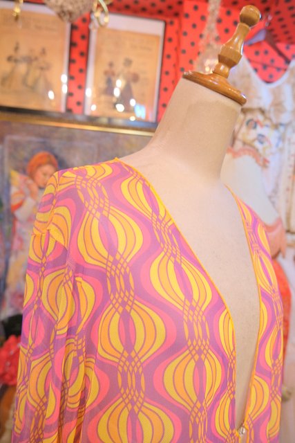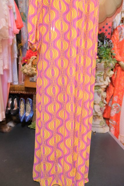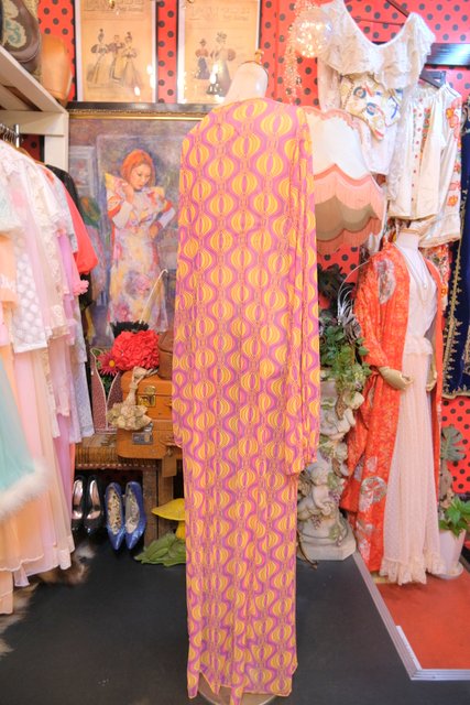 イエロー、ピンク、パープルのレトロヒッピーな総柄に透け感があるメッシュ素材が魅力的なヨーロピアンロングカーディガン羽織