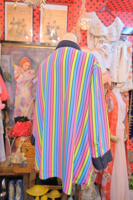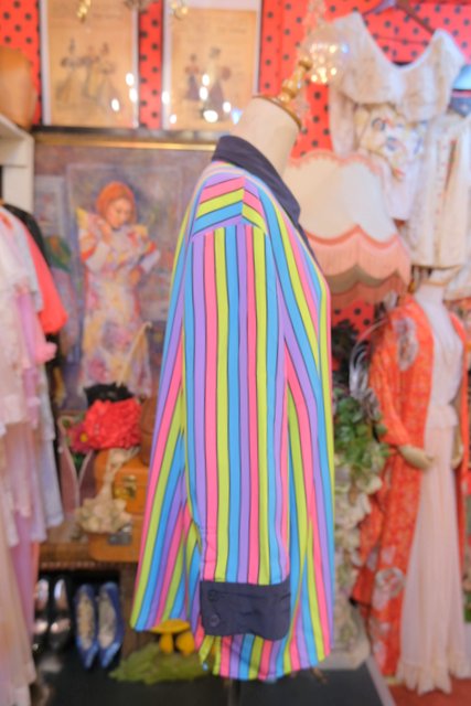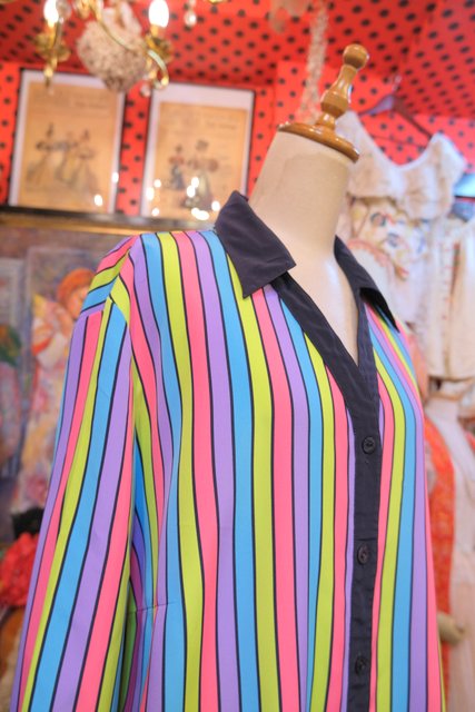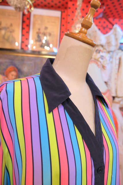 大人エレガンスなテロっと感に水色、黄緑、ピンク、パープルのカラフルポップなストライプが目を惹く1980年代頃のヨーロピアンオーバーサイズシャツ