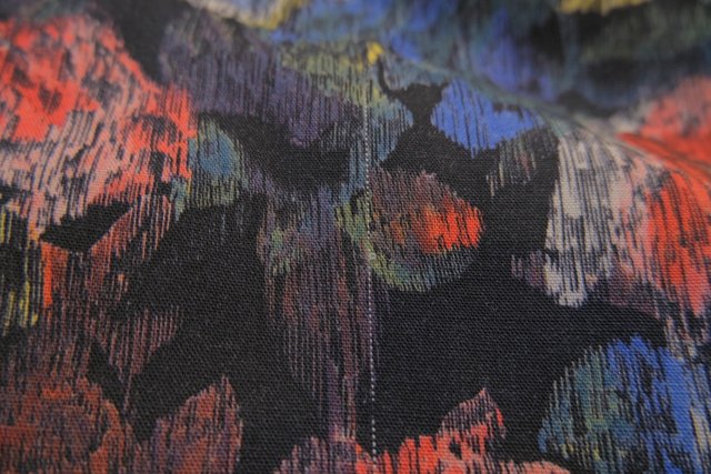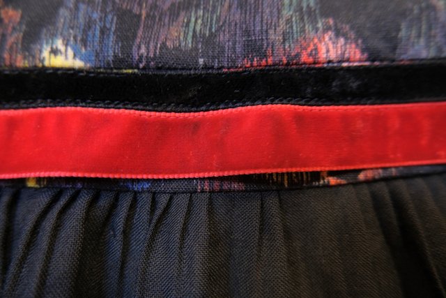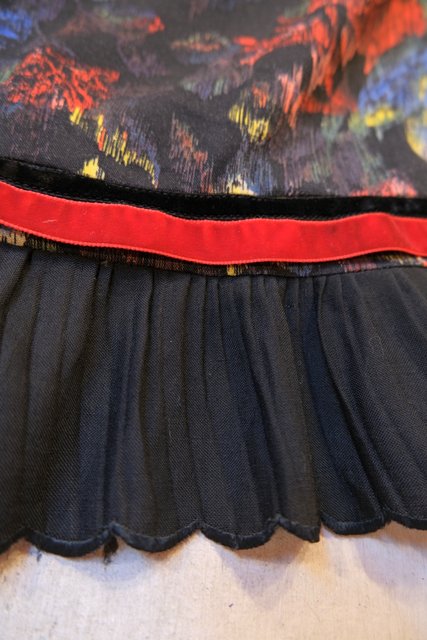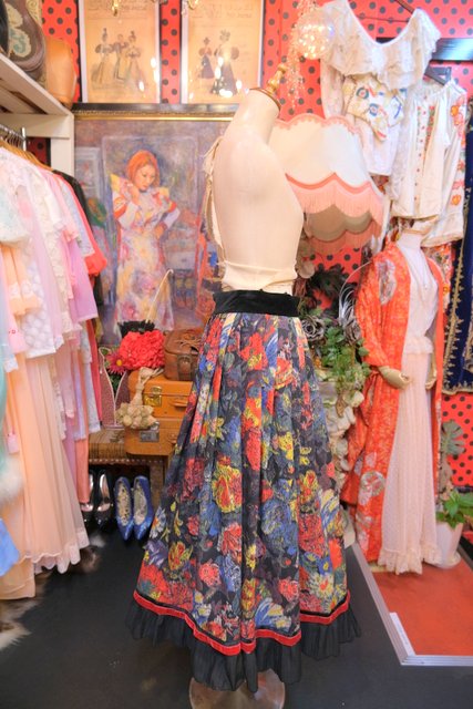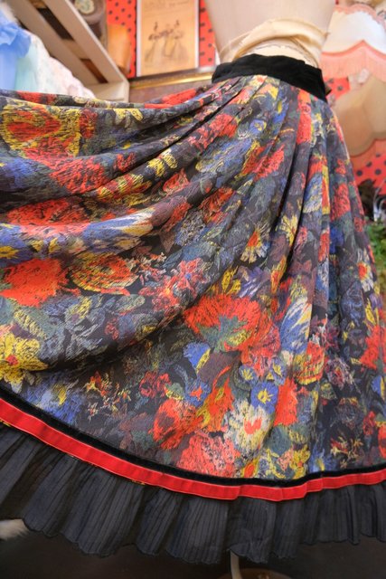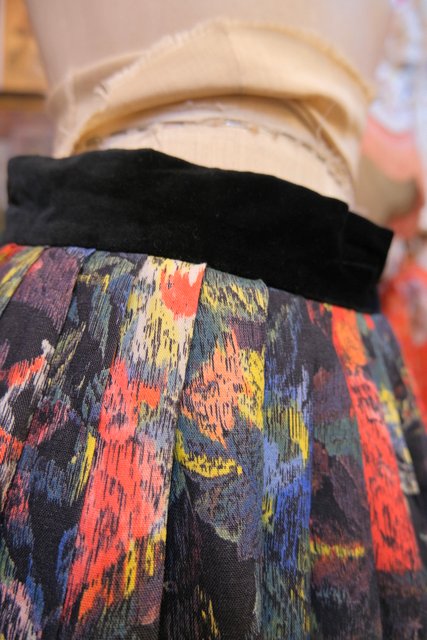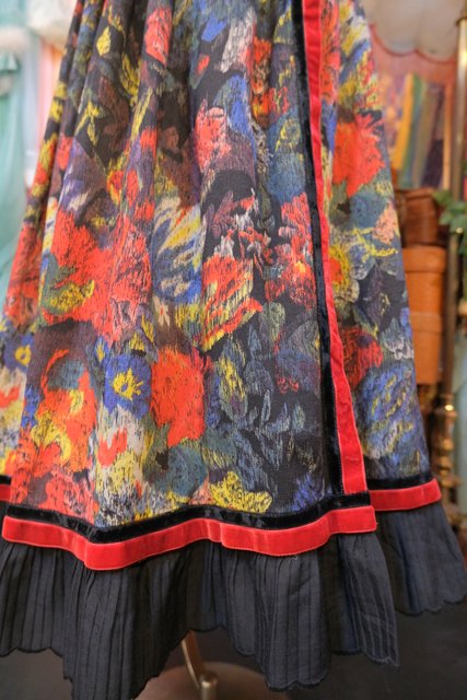 華やかでアートな花柄プリントに高級感漂うウエストや左サイドのベロアデザイン、エレガントな裾のプリーツが魅力的な1980年代頃の旧西ドイツ製ヴィンテージスカート