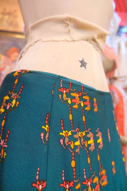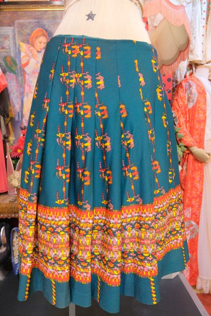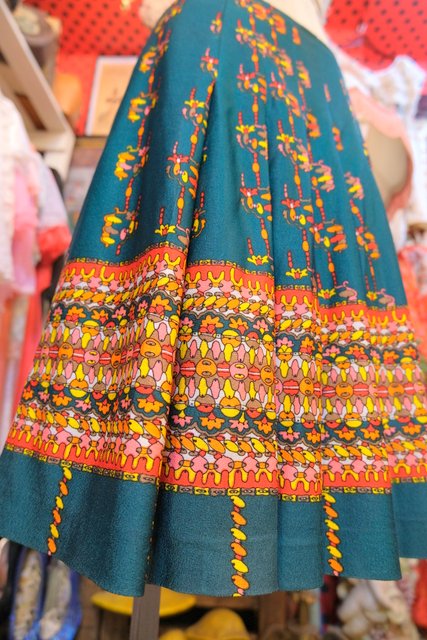 ボトルグリーンベースにカラフルなジオメトリック柄やプリーツデザインが可愛らしい1960年代頃のヨーロピアンヴィンテージスカート