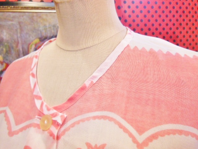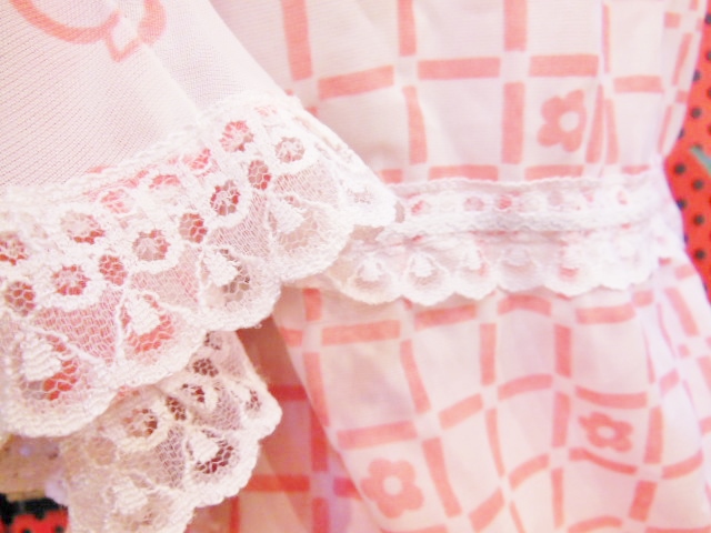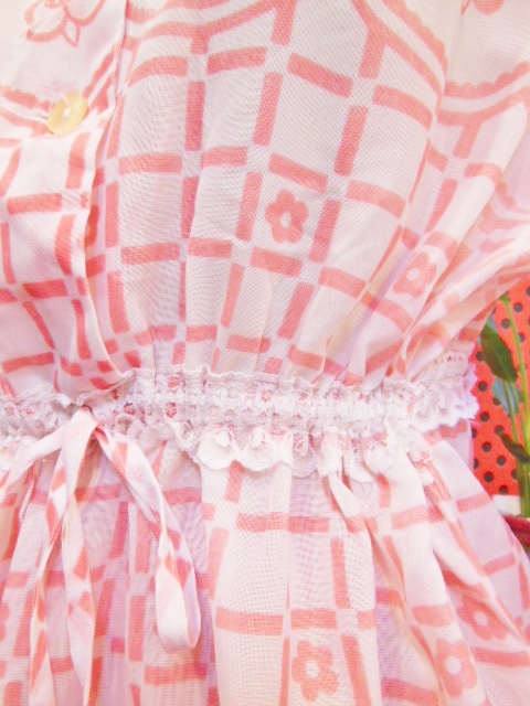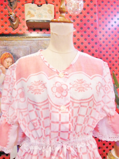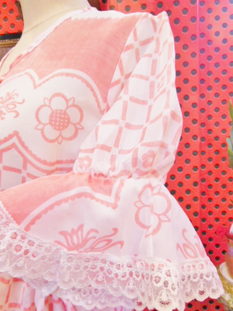 淡いピンクにガ―リーなフリルレースデザイン×レトロポップな花柄プリントが可愛らしい1970年代頃のワンピース★SALE★