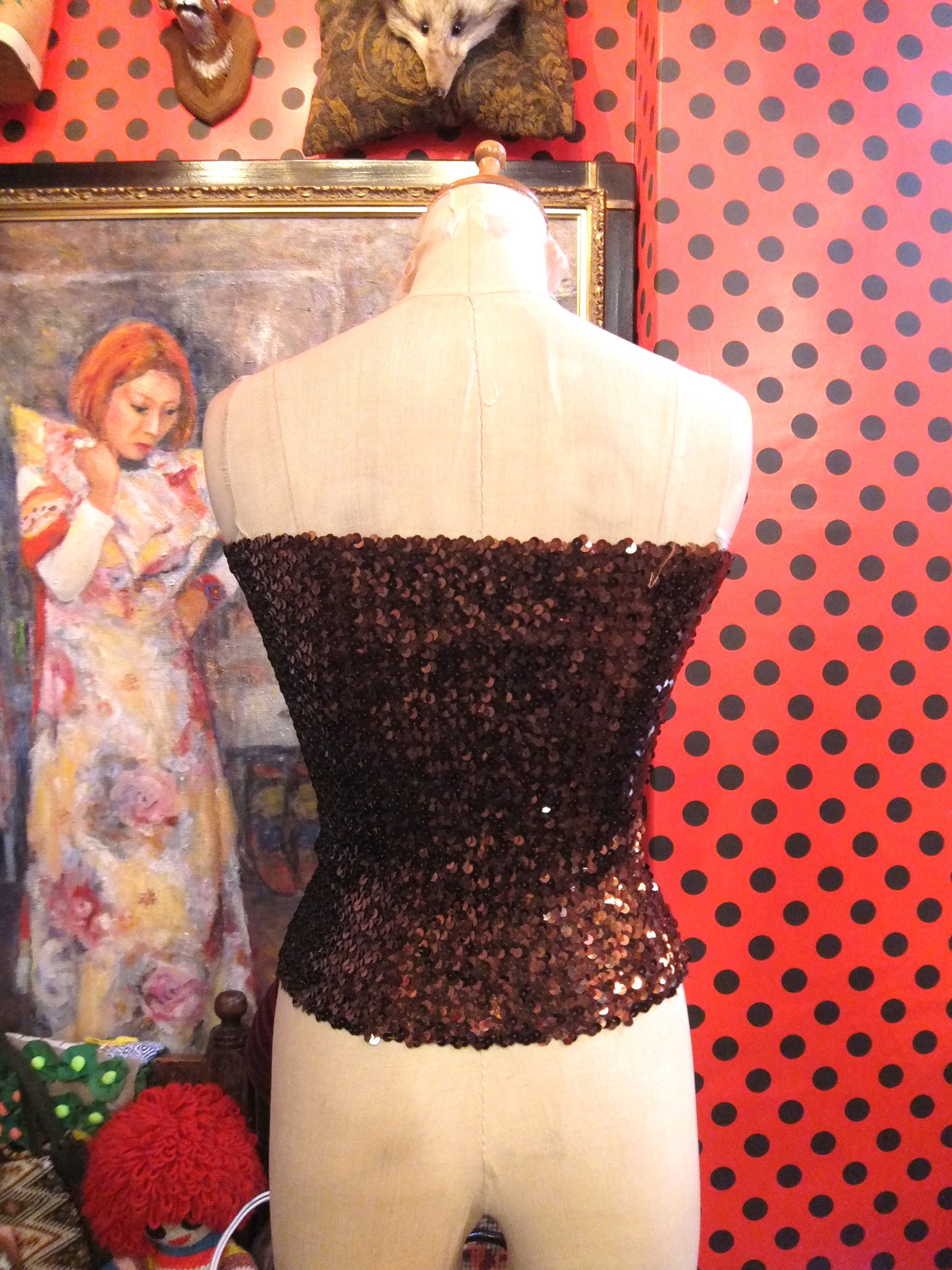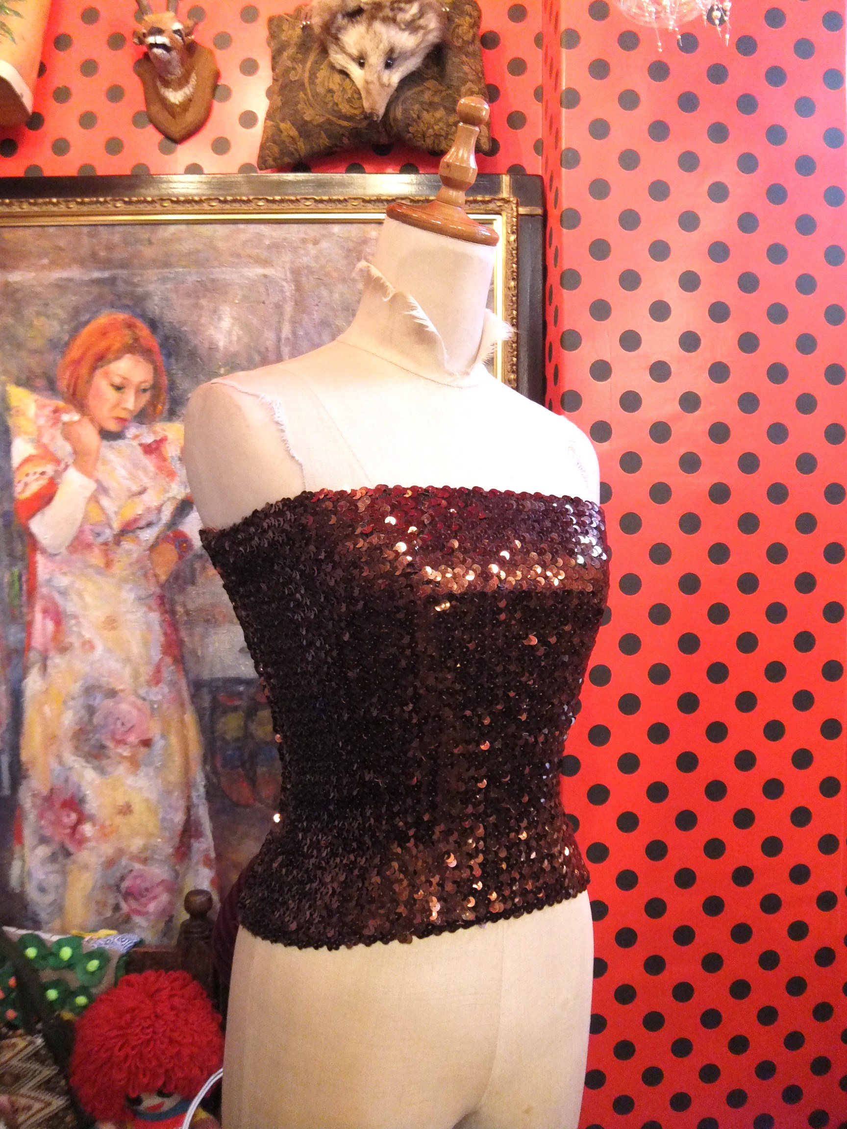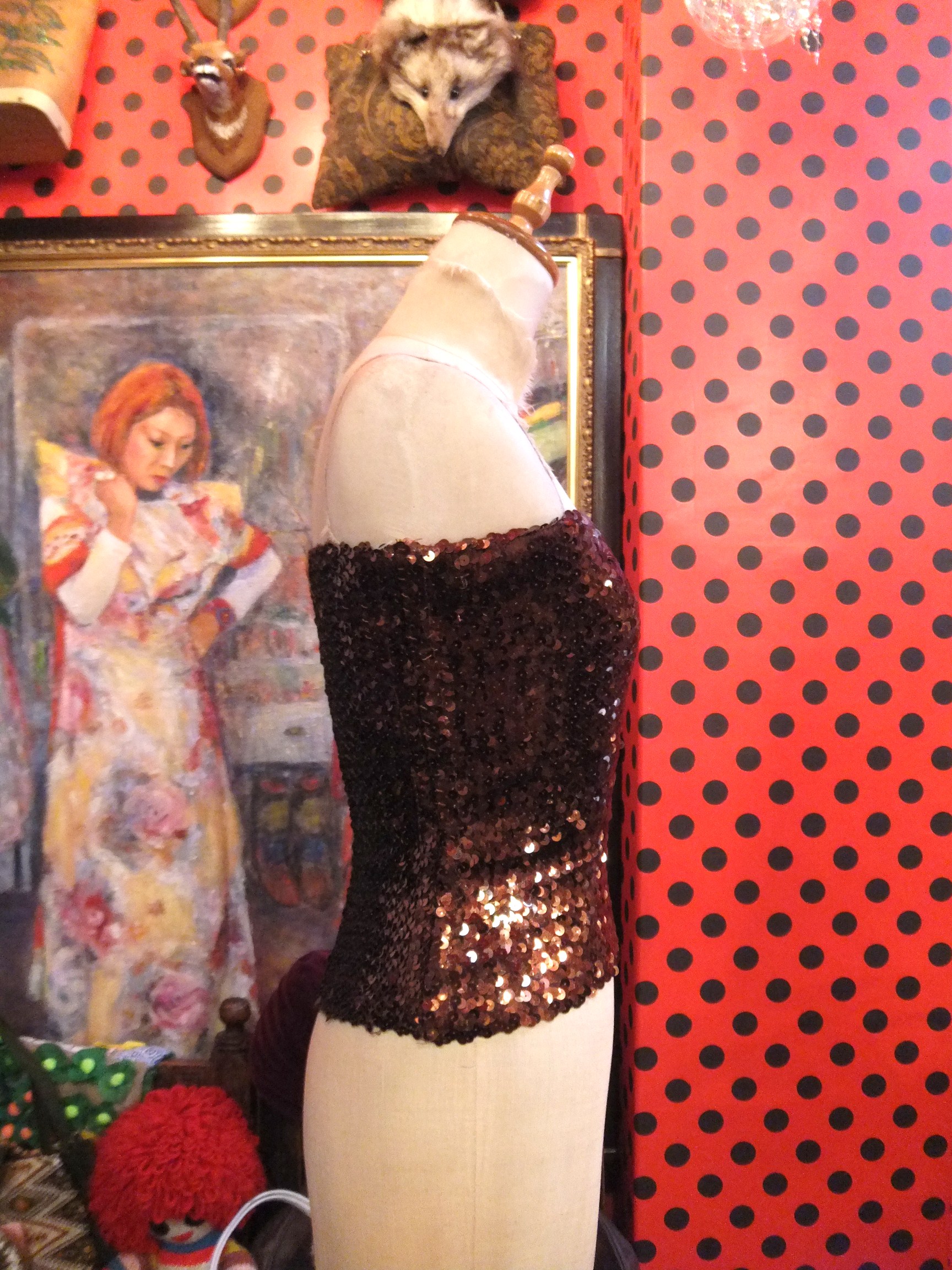 光の反射でキラキラと輝くビジューが魅力の80sヨーロピアンゴージャスベアトップ!パーティや普段着のちら見せ重ね着にも便利なお洒落アイテム!