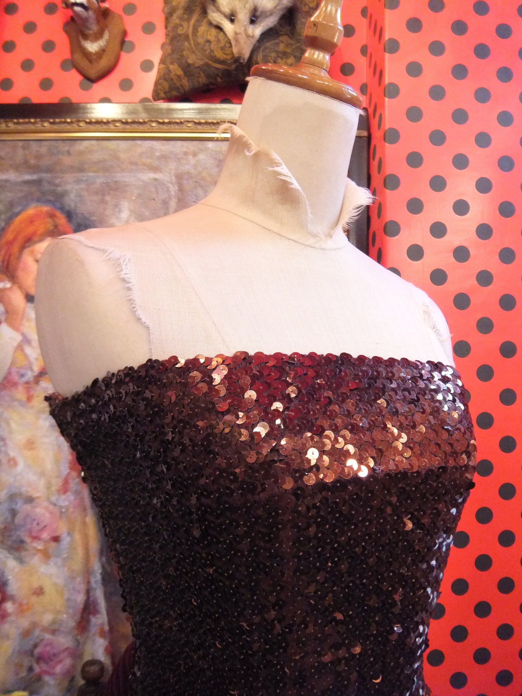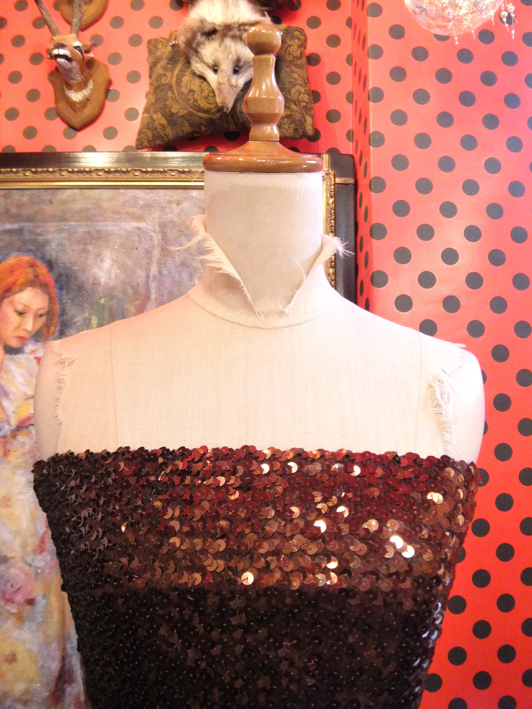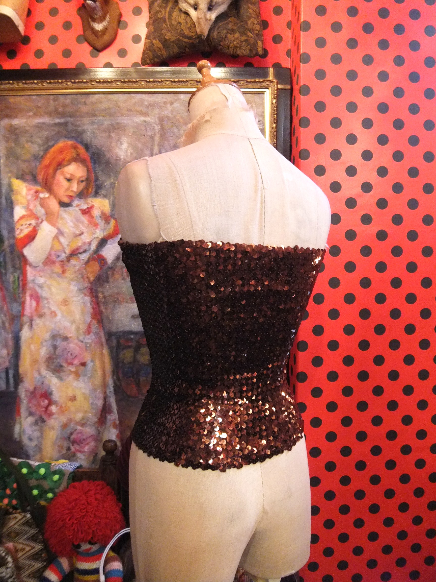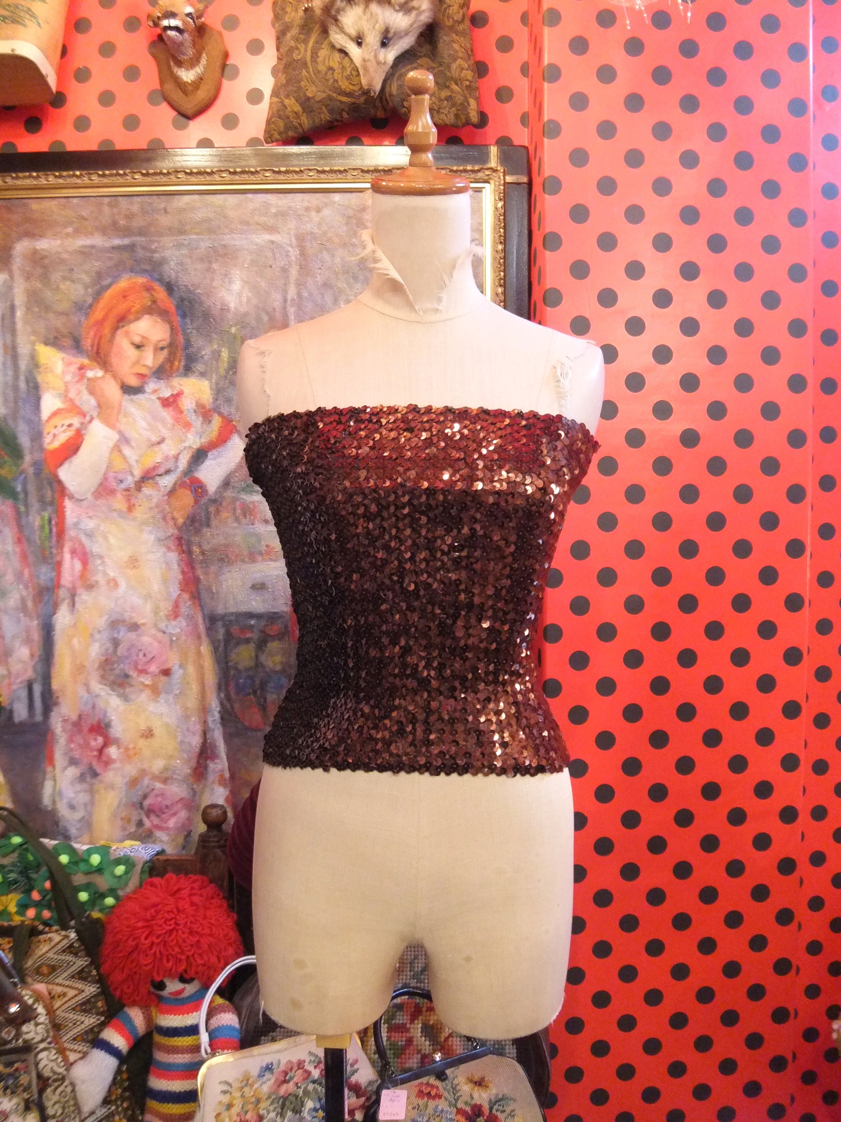光の反射でキラキラと輝くビジューが魅力の80sヨーロピアンゴージャスベアトップ!パーティや普段着のちら見せ重ね着にも便利なお洒落アイテム!