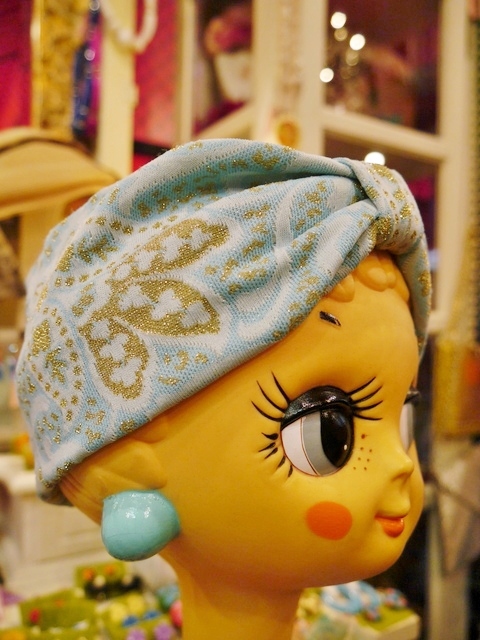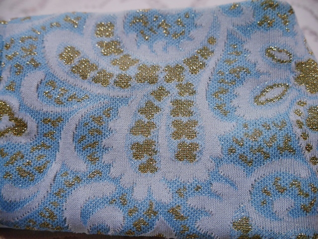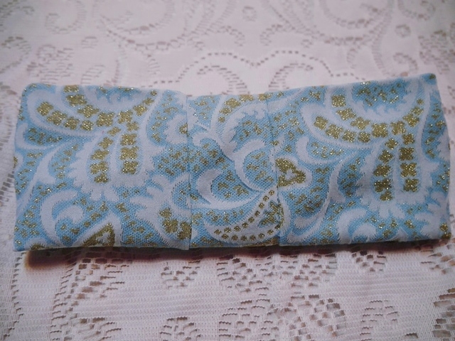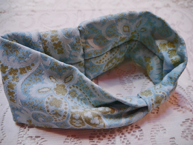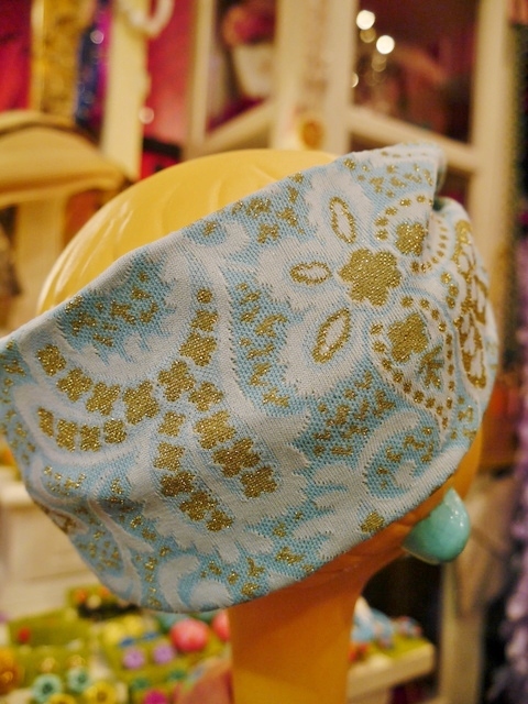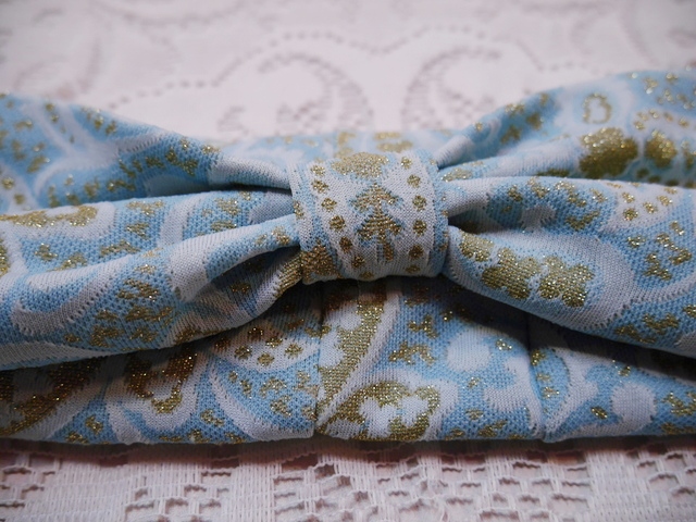 淡い水色ベースに白×ゴールドのペイズリー柄が素敵な1960年代頃のヴィンテージ生地でリメイクされたヘアバンド 白モードファッション、デニムonデニムにプラスするだけでお洒落度UP!
