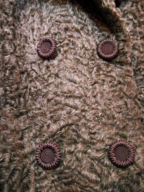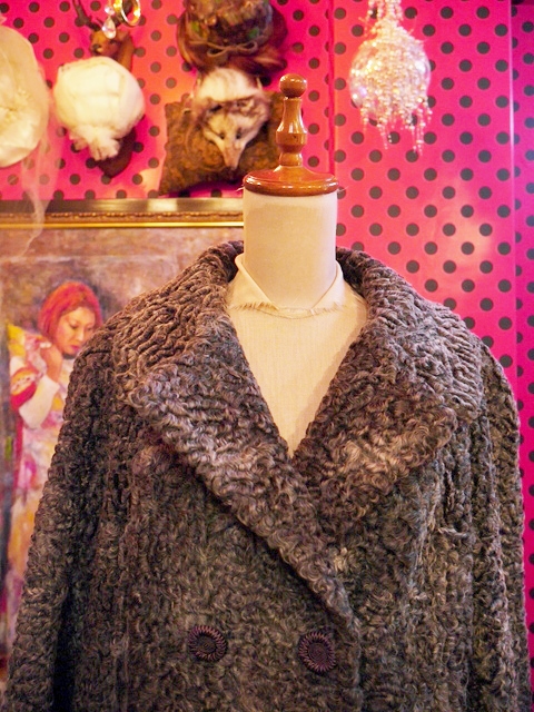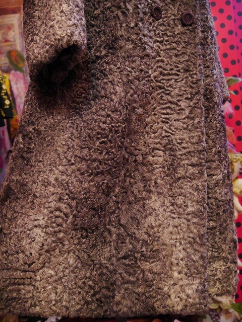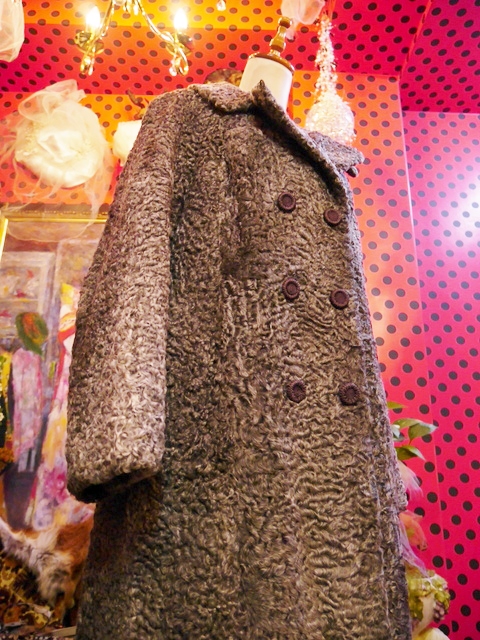 パリのアンティークショップで見つけたラムの中でも高級とされる巻き毛の形状により様々な美しい斑紋が見られるのが特色のヴィンテージカラクールラムファーコート グレイベースなのでブラック小物と合わせて大人クラシカルスタイルがおススメ!