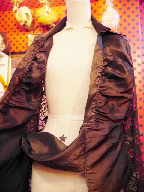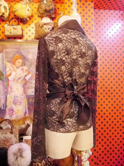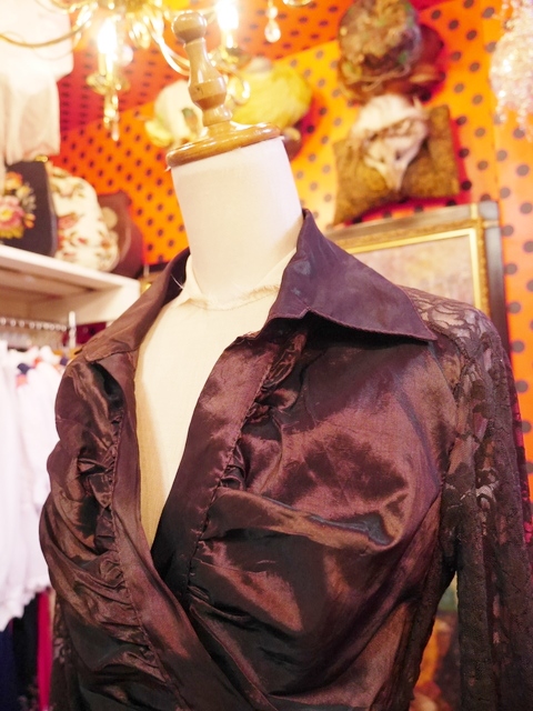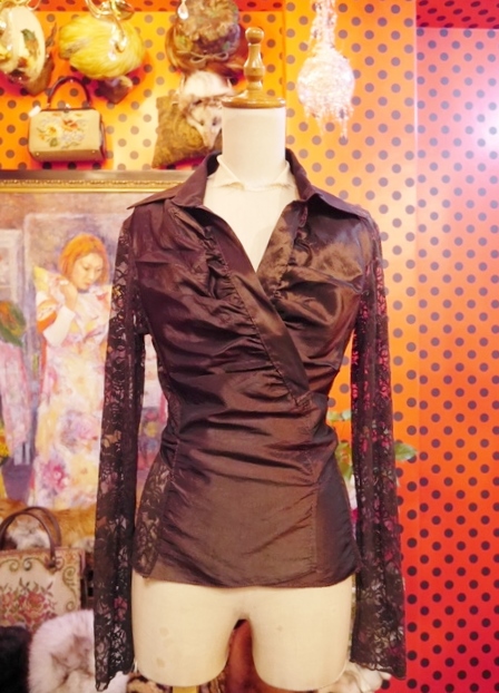 光沢がありドレープ感のあるカシュクールデザインに袖と背中の可憐な花柄レースデザインが素敵なイタリア製ヴィンテージブラウス 色々アレンジできるお洒落アイテム!