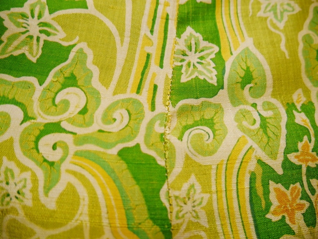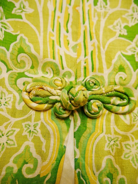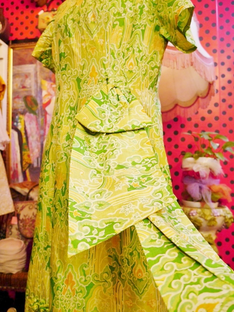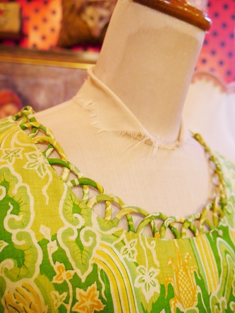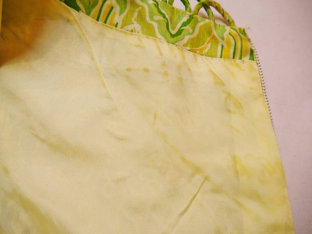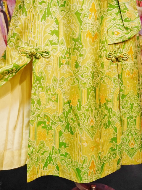 黄緑ベースのサイケデリック模様に首元のデザイン×インパクトたっぷりの大きなコサージュが素敵な1960~70年代頃のヨーロピアンロングドレス 前身頃のスリットとアジアンノットがお洒落ポイント!★SALE★