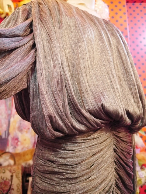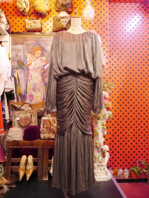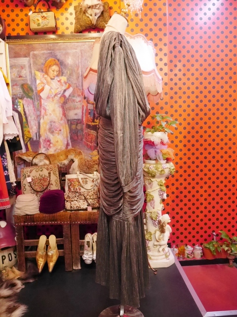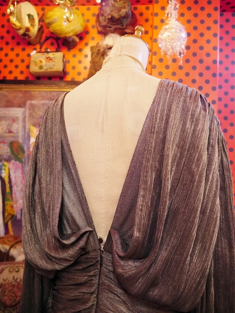 一枚で存在感と迫力がある旧西ドイツ製ヴィンテージロングドレス 全体的に軽やかに動きがあるドレープデザインが素敵な個性派パーティドレス 背中が大きく開いたセクシーデザインがお洒落ポイント!
