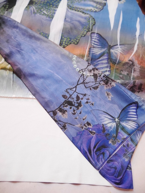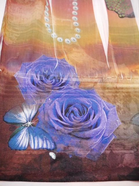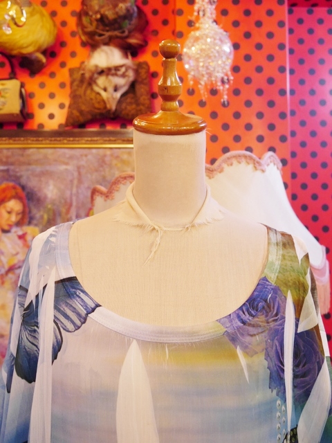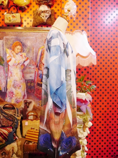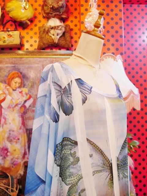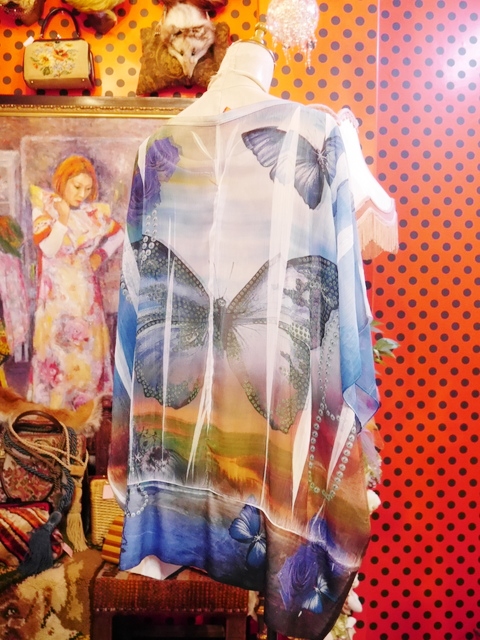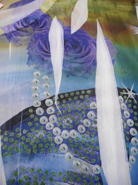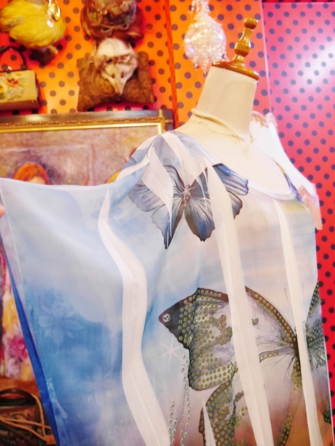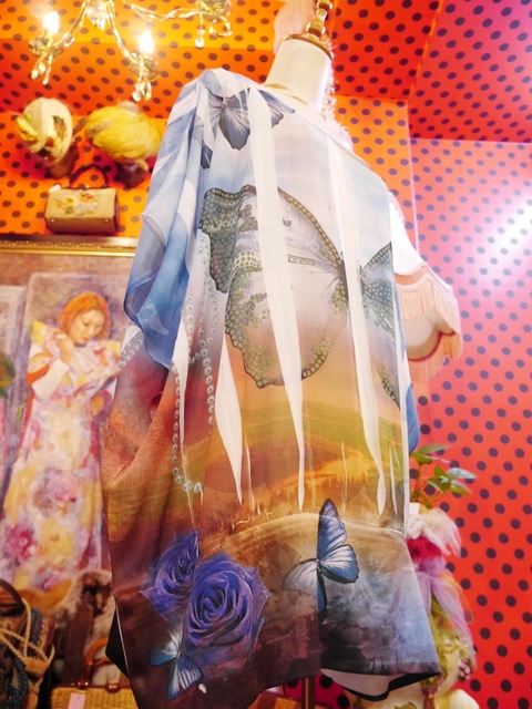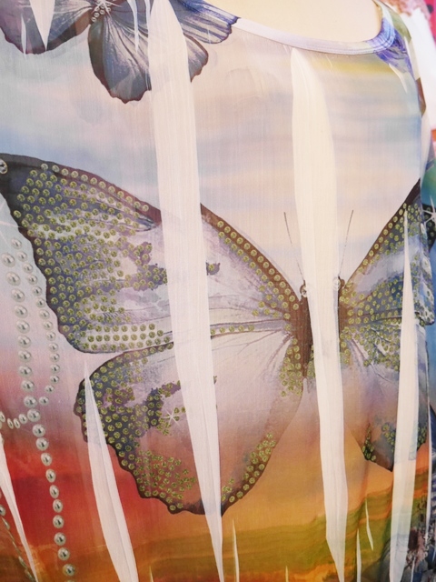 インパクトたっぷりの大きな蝶にパールや薔薇がプリントされたフランス製シフォンドルマンスリーブロングカットソー 丈長デザインなのでミニワンピースで着てもお洒落!★SALE★