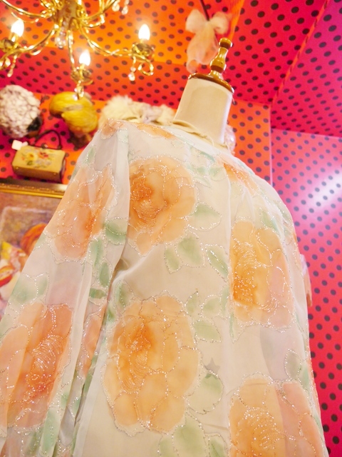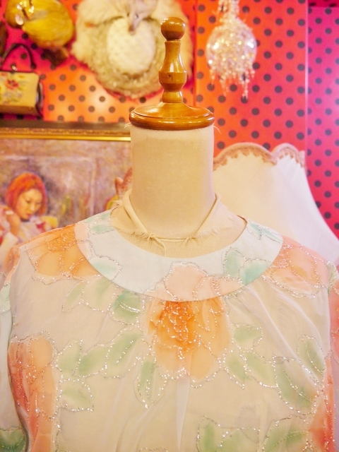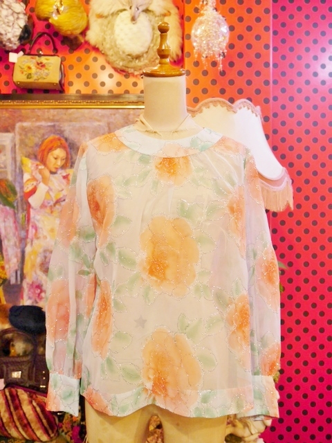 透け感がある淡いアイスグリーンシフォンのボディにシルバーの薔薇柄を薄く淡い赤ピンクとグリーンでデザインされたふんわりガーリーな1970年代ヨーロピアンカットソー ★SALE★