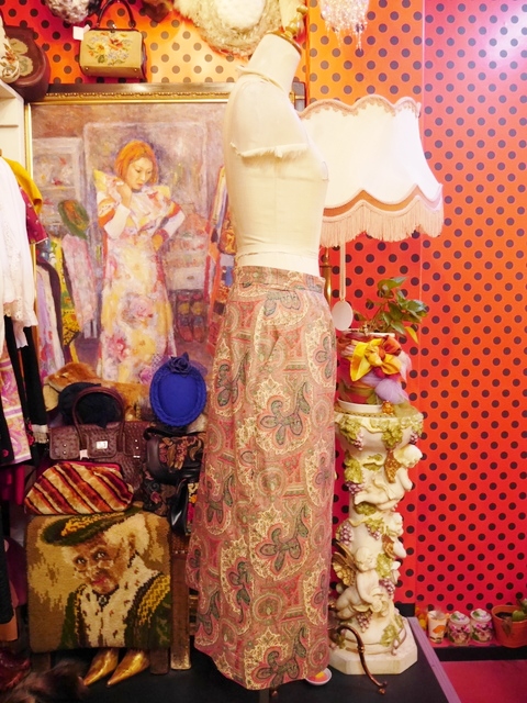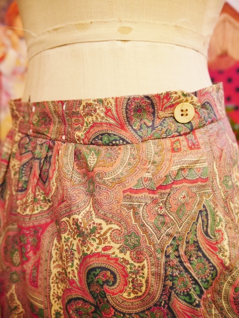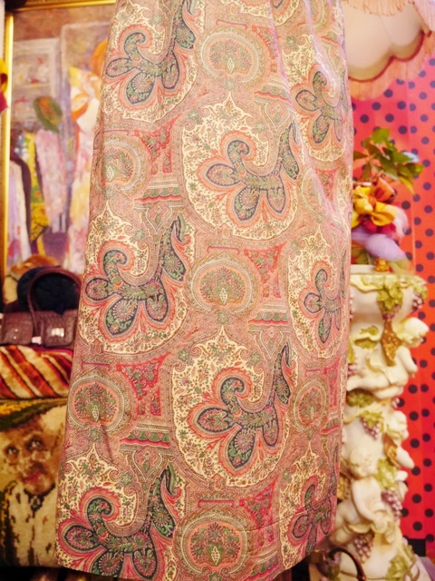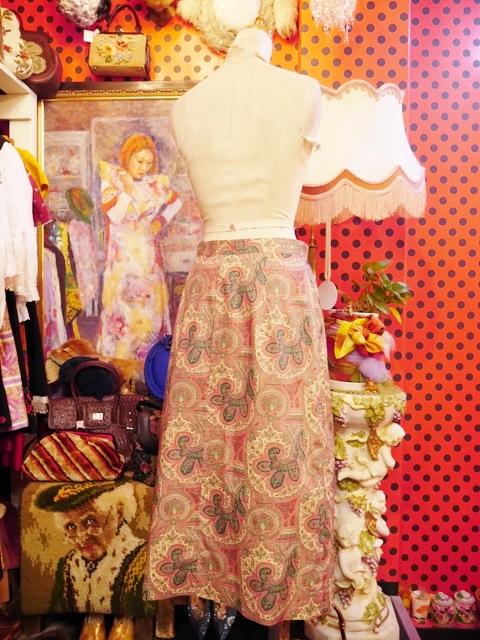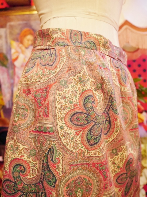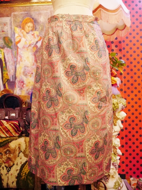 マニッシュな印象の広がりが少ないタイトなデザインにピンクベージュ×ネイビーのサイケデリック柄が素敵なUSA製スカート ★SALE★